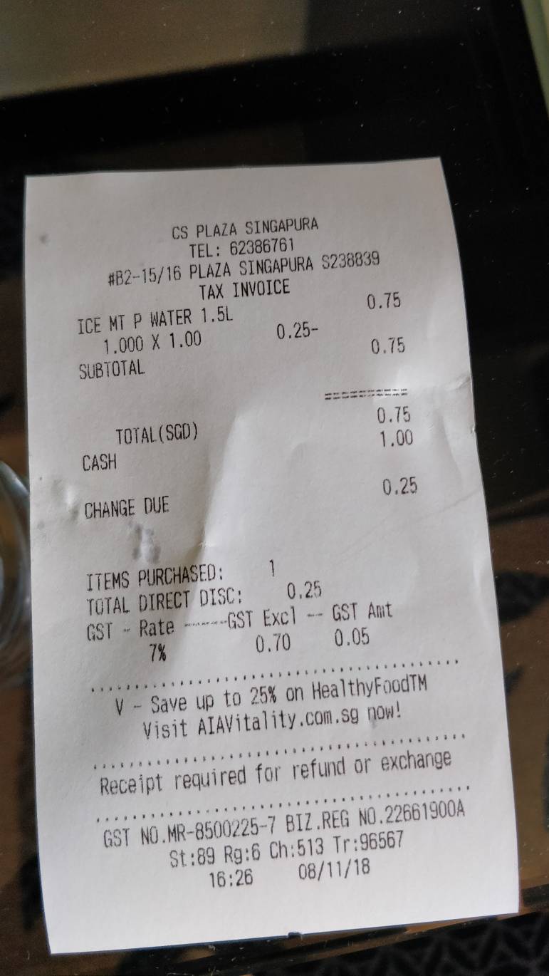เลือกน้ำดื่มที่ถูกสุดมา ราคา 0.75 สิงคโปร์ดอลลาร์ ( แอบแพงอยู่นะ)