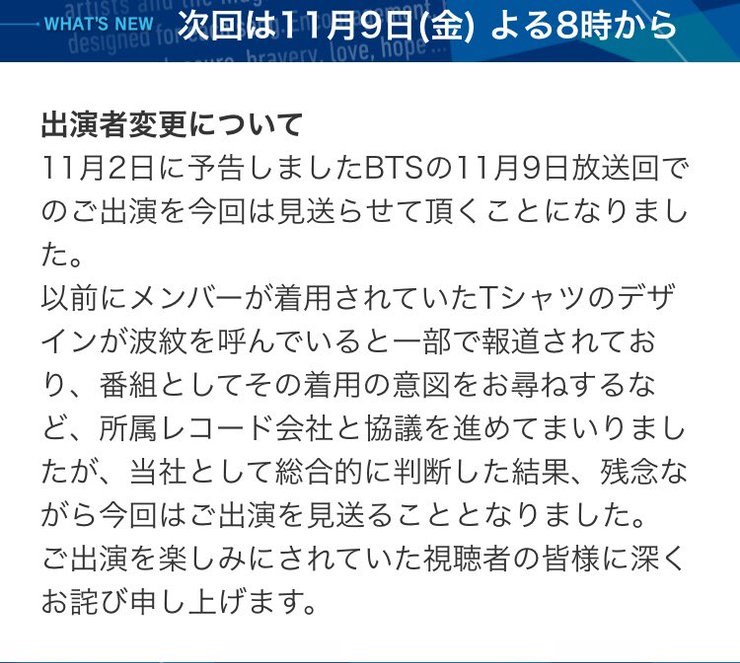Music Station ได้มาอัพเดตไลน์อัพใหม่และบทสรุปคือ BTS จะไม่ขึ้นแสดงที่รายการ Music Station ในวันพรุ่งนี้ (9 พ.ย) แต่จะขึ้น Tokyo Dome ในวันที่ 13-14 พ.ย นี้ ตามตารางงานเดิม