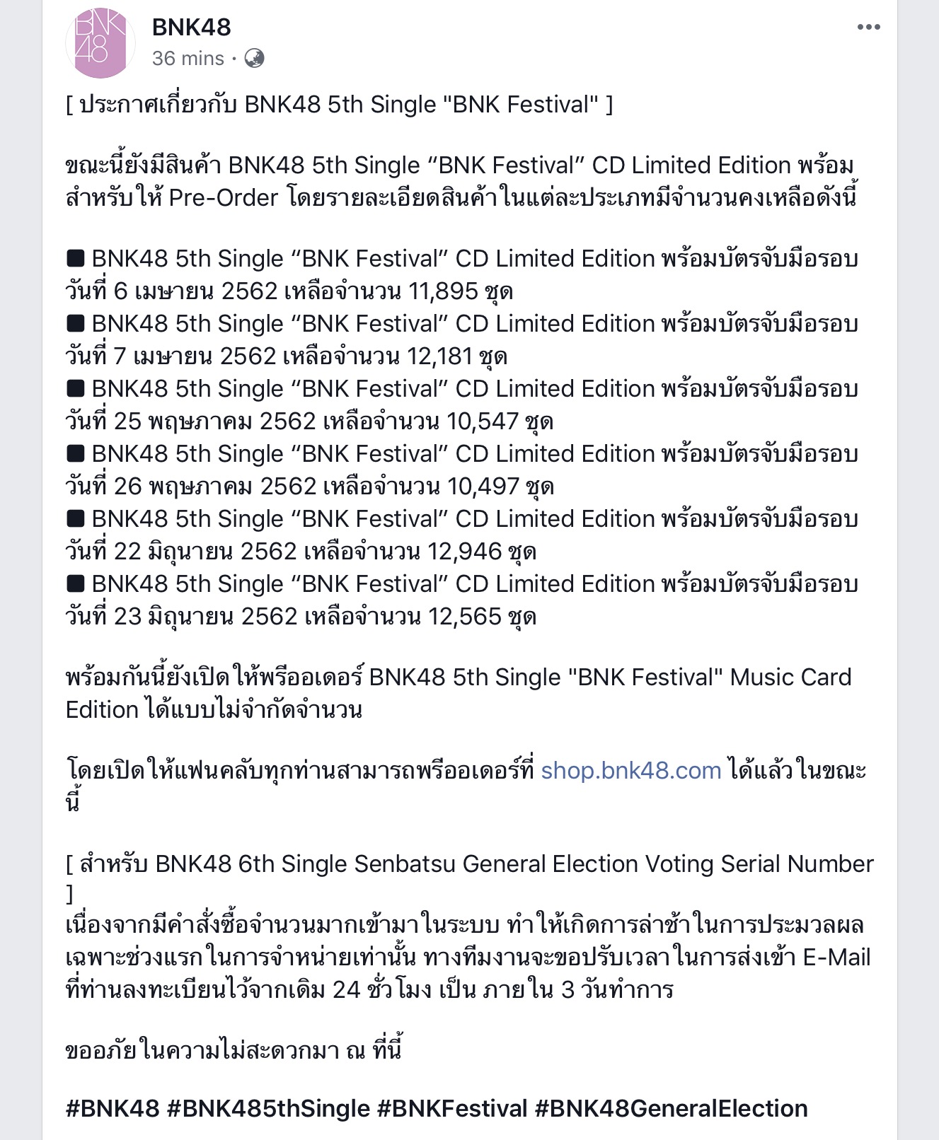 เหลือเวลาอีกเพียง 24 ชม. ในการสั่งซื้อ Music Card BNK48 5th Single ที่มาพร้อมกับ Code ลงคะแนน BNK48 6th Single Senbatsu General Election การจำหน่าย Music Card จะปิดการขาย เวลา 12:00 น. ของวันที่ 22 ม