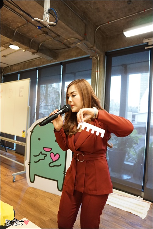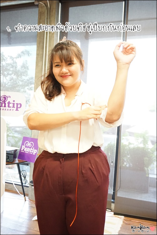 จากนั้นน้องญาญ่าสาธิตวิธีการโดยการเริ่มป้ายผลิตภัณฑ์ปริมาณเท่าเม็ดถั่ว