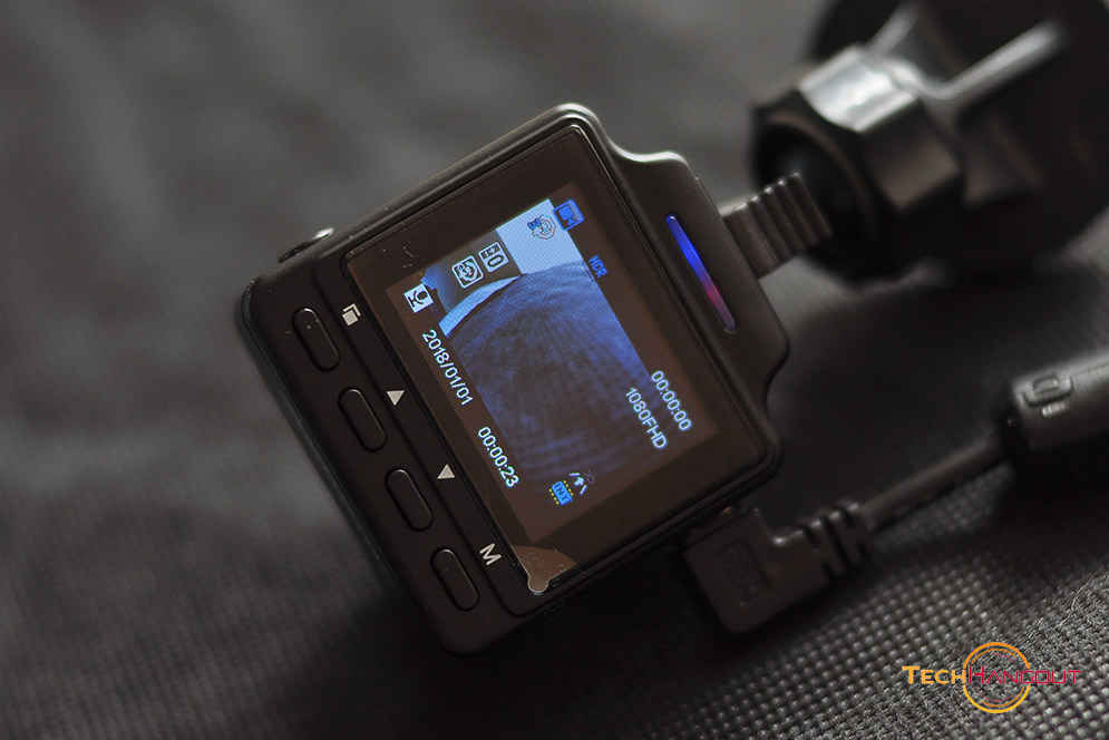 ด้านหน้าจอ 1.5 นิ้ว ขนาดเล็กๆพอดีตัวกล้องพร้อมปุ่มควบคุมทั้ง 4 ปุ่มหลักๆครับ ปุ่มเข้าเมนู-ขึ้น-ลง -โหมด ซึ่งปุ่มโหมดนั้นจะเป็นการเปลี่ยนหลักๆคือ ถ่ายรูป – วีดีโอ – ดูไฟล์ครับ ส่วนปุ่ม OK จะกดด้านซ้ายของตัวเครื่องเวลาจะเลือกเข้าเมนูอะไรต่างๆครับผม คือปุ่ม Play/Pause ด้านซ้ายที่ได้บอกไปก่อนหน้านี้นั้นเอง
