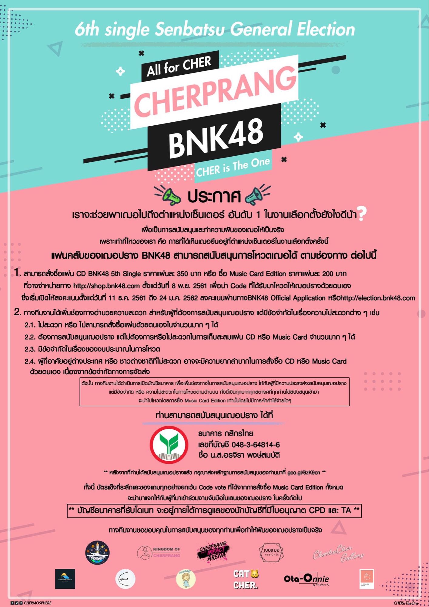 มาแล้วครับช่องทางการโดเนทเงินเพื่อ Vote “เฌอปราง” สู่ตำแหน่ง CENTER ใน single6 BNK48