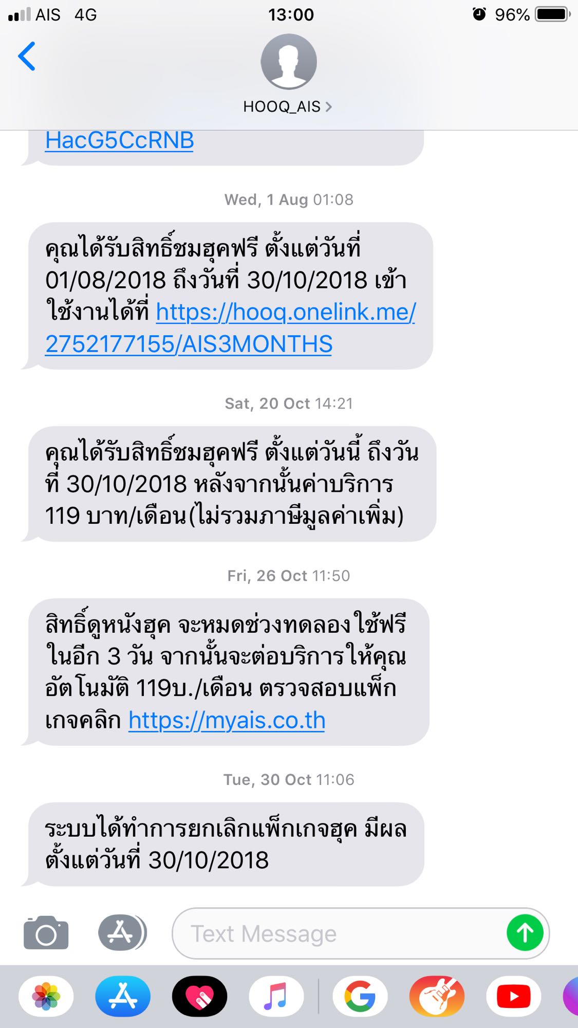 คือเราได้ทำการยกเลิก Hooq ของ Ais ไป เมื่อวันที่ 30 ตค. 2561 เนื่องจากเราได้ข้อความว่าเราได้รับสิทธิ์ฟรีถึงวันที่ 30 ตค. 2561 และก่อนหน้านั้นเราพยายามยกเลิกมาตลอด
