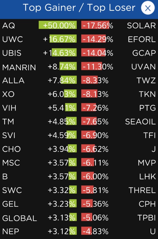 เซ็ทวันนี้ให้อารมณ์เหมือนงานเลี้ยงกำลังจะเลิก ถ้าใครไปเดินตลาดนัด เวลาฝนไกล้ตก ร้านเล็กร้านน้อยจะเก็บของก่อน เพราะไม่มีหลังคา ส่วนร้านใหญ่ๆจะนั่งกระดิกดูให้แน่ๆก่อน เพราะมีโครงสร้างที่ดีกว่า ถ้าตกหนักพวกๆนี้ถึงจะเก็บร้าน อย่ามโน อย่ามีอีโก้ ขาเก็งกำไรกันทั้งนั้นแหล่ะครับในสินธร วีไอแท้ๆเค้าไม่มานั่งลุ้นหน้าจอกันแบบนี้หรอก หุ้นหลายๆตัวตกหนัก คนมีทุนก็ยิ้มหน้าระลื่นเลียปากกันแพร่บๆ รอเวลา คนที่ดอย คนที่ไม่มีทุนก็เครียดล่ะครับ เพราะหลายๆตัว ช้าเกินกว่าที่จะคัทแล้ว ช่วงบ่ายแนวโน้มไม่ดีตามดัชนีภูมิภาคค่อนข้างแน่ เตรียมแผนกันดีๆครับ จะหมอบรอ หรือ จะสู้