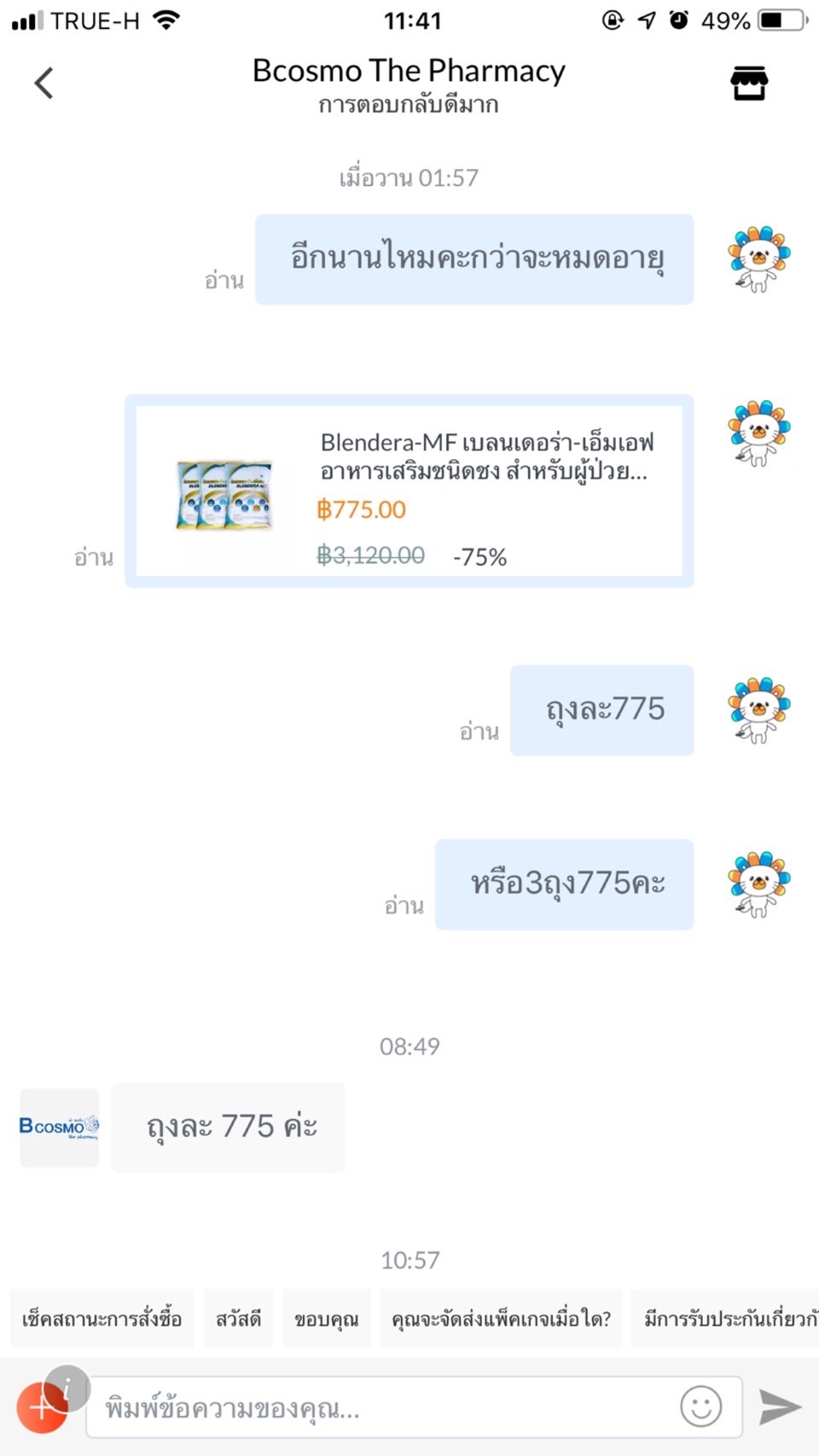 ร้าน Bcosmo The Pharmacy เพิ่งตอบกลับมาว่า ถุงละ 775 บาท แล้วก็ขอโทษ จบ