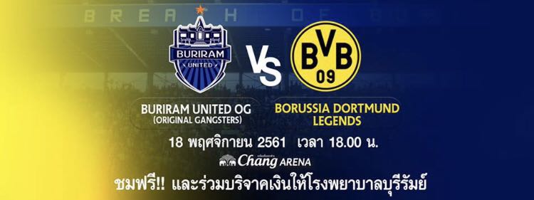 18 พ.ย. 61 (กระชับมิตรการกุศล) Buriram United OG vs Borussia Dortmund Legends 18:00 น. ณ ช้างอารีนา **ชมฟรี และร่วมบริจาคเงินให้โรงพยาบาลบุรีรัมย์