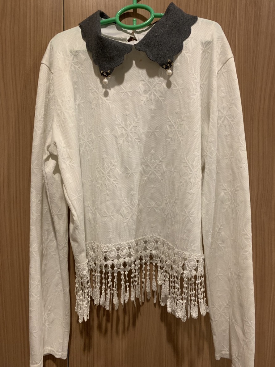3.เสื้อแขนยาวสีขาว ผ้าดี ปลายเสื้อน่ารัก มีตำหนินิดเดียวค่ะ ขาย 70