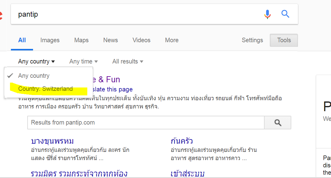 ส่วน Youtube คลิปไหนที่ล็อกไม่ให้ประเทศไทยดู เรากลับดูได้ หรือเวลาเราเสิร์ซอะไรจาก Google ตรงช่อง Tool ก็ถูกเซ็ตเป็นประเทศสวิสเซอร์แลนด์ตามภาพเลยค่ะ