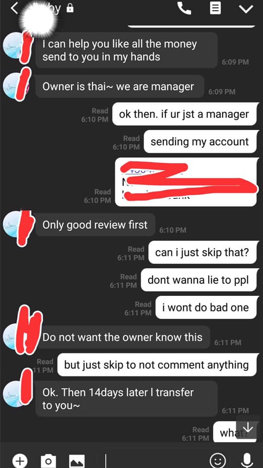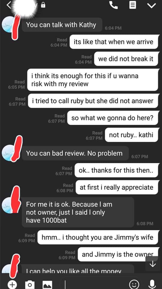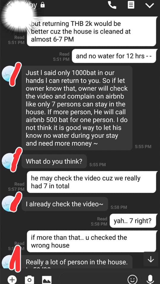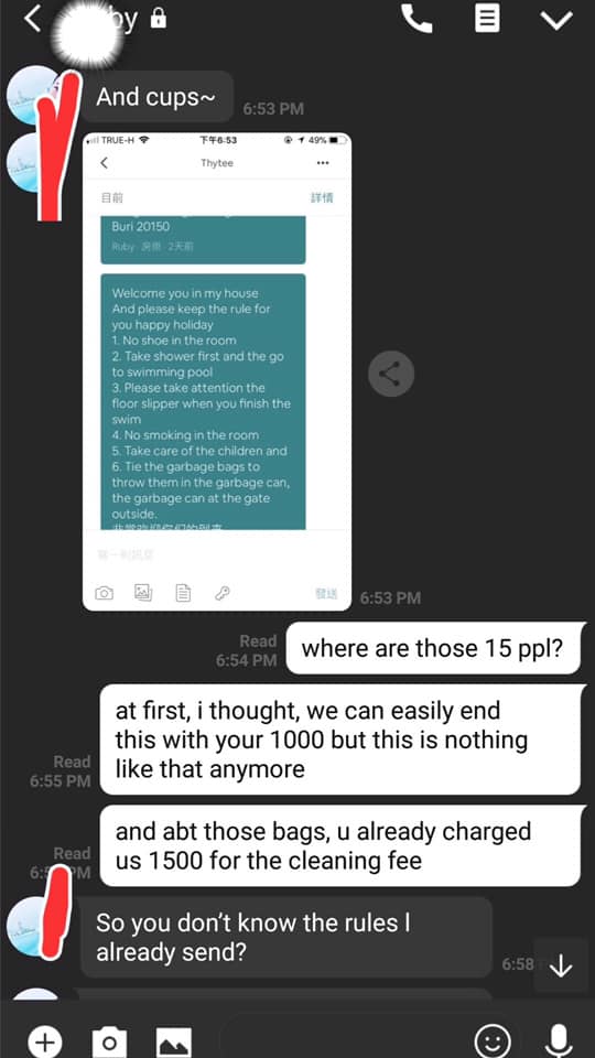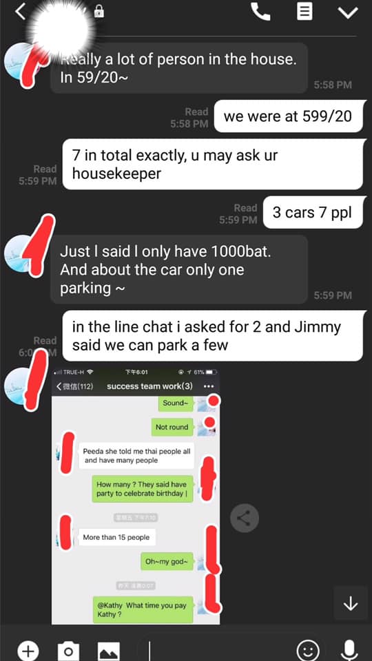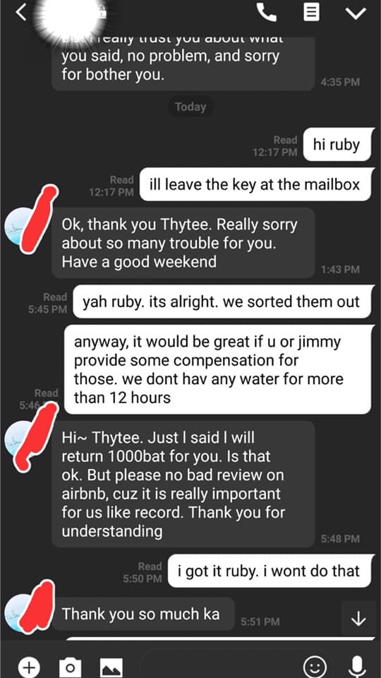 ค่ำๆ เพื่อนคนที่จ่ายค่าที่พัก แคปแชทไลน์ที่คุยกับคนดูแลบ้านมาให้อ่าน
