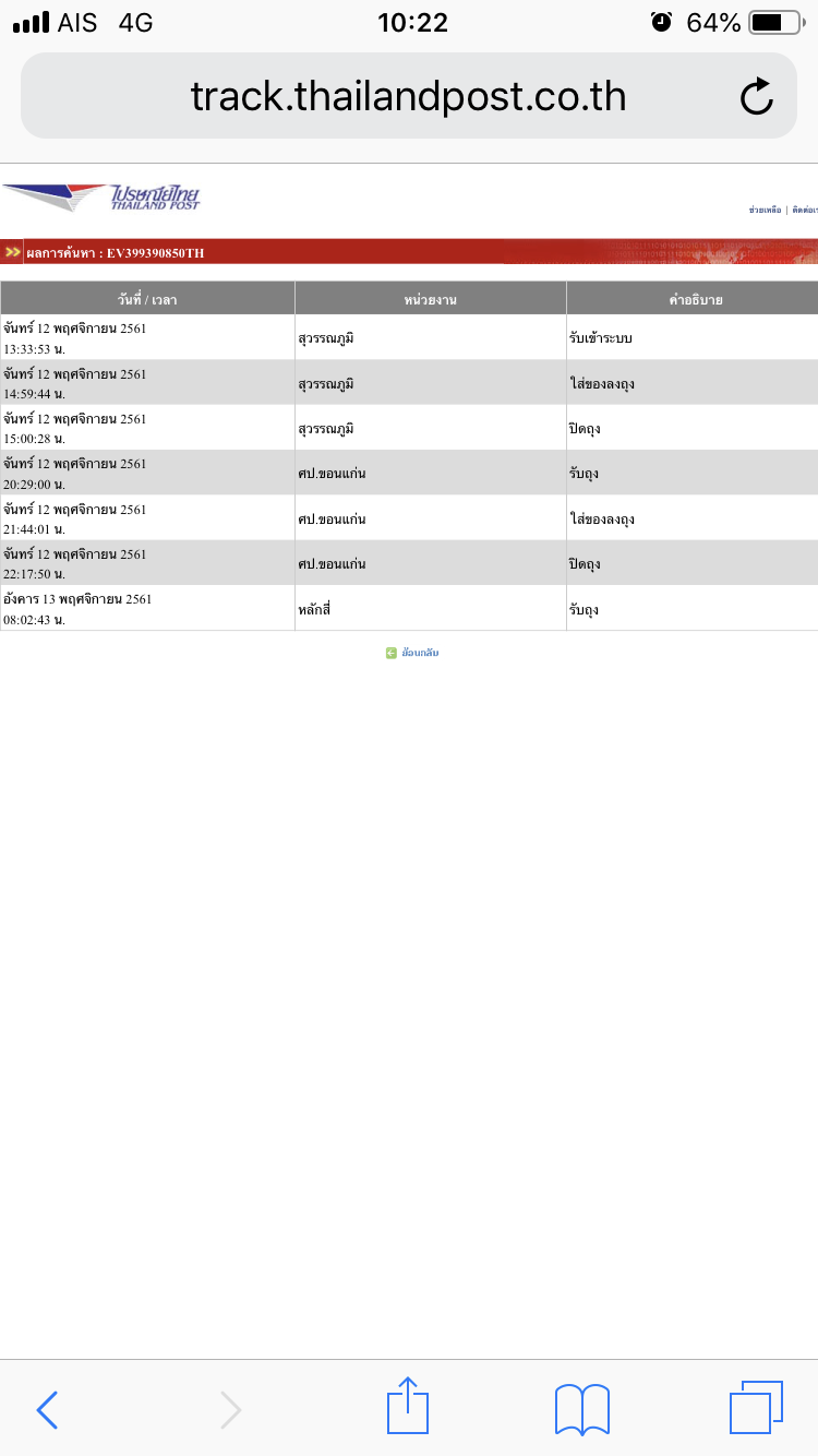 ผมรอพัสดุส่งแบบ EMS หมายเลข EV399 390 850 TH ขึ้นสถานะตามภาพ เมื่อวานประมาณ 15.00 น. โทร. ไปคอลเซ็นเตอร์ จนท. รับเรื่องและบอกว่สจะส่ง/ป ปณ. ปลายทางตราจสอบ เมื่อเช้าประมาณ 10.00 น. โทร. ไปสอบถามได้รับแจ้งว่า วันนี้ให้รอปณ. ปลายทางติดต่อหรือรอพัสดุ ผมเลยสอบถามไปว่าหากวันนี้ยังไม่ทราบหรือยังไม่ได้รับของจะดำเนินการอย่างไรต่อ ได้รับคำตอบคือให้โทร. ติดต่อใหม่ ผมว่สระยะเวลาระหว่างที่โทร. ไปติดต่อคอลเซ็นเตอร์ทั้งสองครั้งน่าจะเพียงพอในการตรวจสอบแล้ว