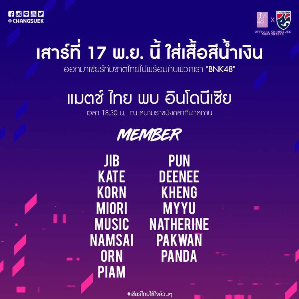 รายชื่อสมาชิก BNK48 ที่จะไปเชียร์ทีมชาติไทยใน AFF Suzuki Cup รอบแรก ที่ราชมังคลากีฬาสถาน (9 17 25 พฤศจิกายน)