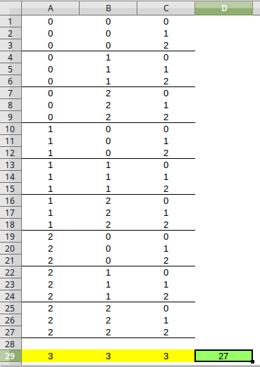 จากวิธีการหาจะสังเกตุเห็นว่าในตัวเลขหลักผั่งซ้ายสุดจะหักออกไปหนึ่งค่าเสมอ (จากตัวอย่างรูปแรก เลข 6 ตัว จะตัดออก 1 จึงเหลือ 5 เดาว่าเป็นเลขศูนย์หรือเปล่า) เราเลยอยากรู้ว่าเหตุใดจึงต้องหักออกไปหนึ่งค่า เราเลยลองใส่ตัวเลขแค่ 0,1,2 ลงในตาราง มาให้ผู้รู้มาช่วยระบุว่าแถวไหนที่ต้องตัดออก