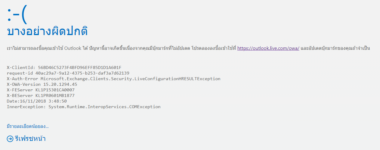 เมล Outlook เข้าไม่ได้ครับ มันขึ้นว่า มีบางอย่างผิดพลาด โปรดลองอีกครั้ง เป็นมาหลายวันแล้ว ต้องทำยังไงเหรอครับ ขอบคุณมากครับ