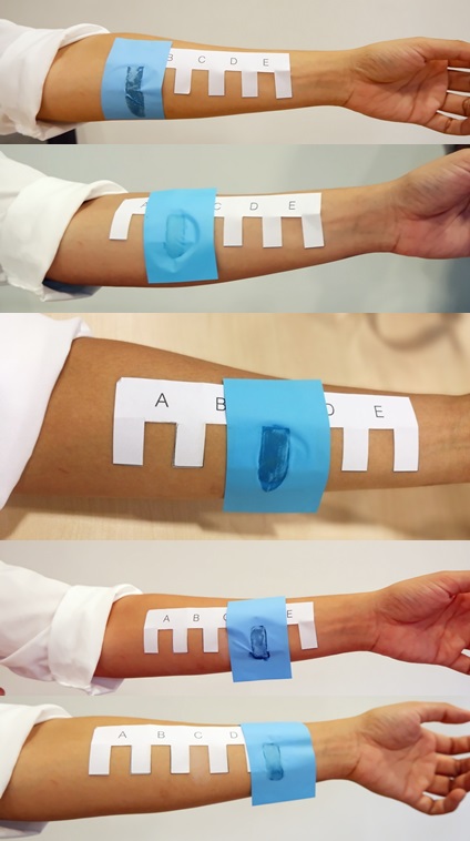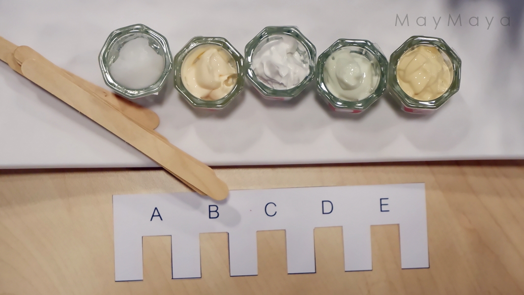 เริ่มต้น ทางทีมงานให้เราทดลองการเกลี่ยทา แล้วดูการซึมลงผิว และ การทิ้งคราบมันของครีมทั้งห้าเลยค่ะ