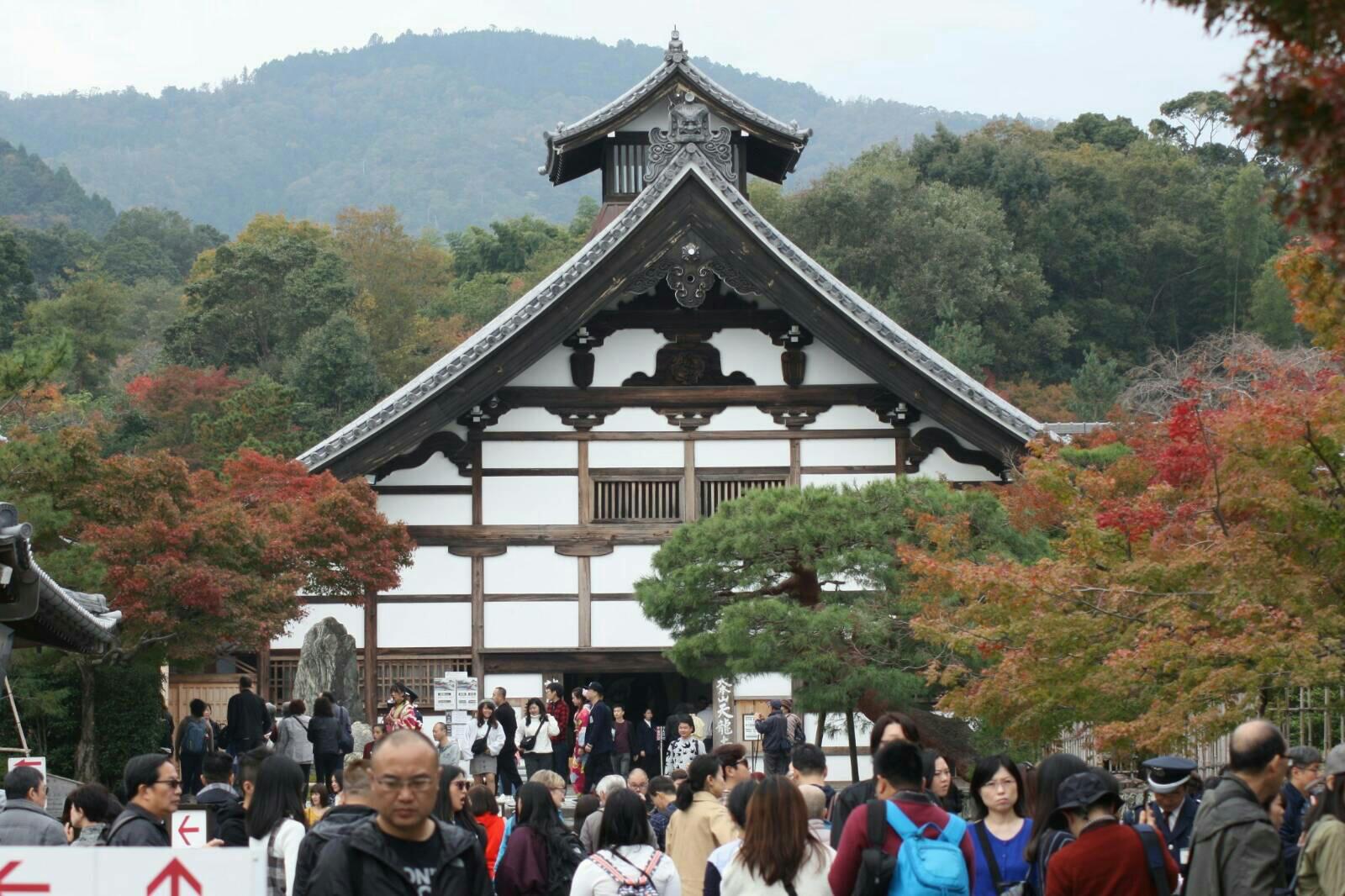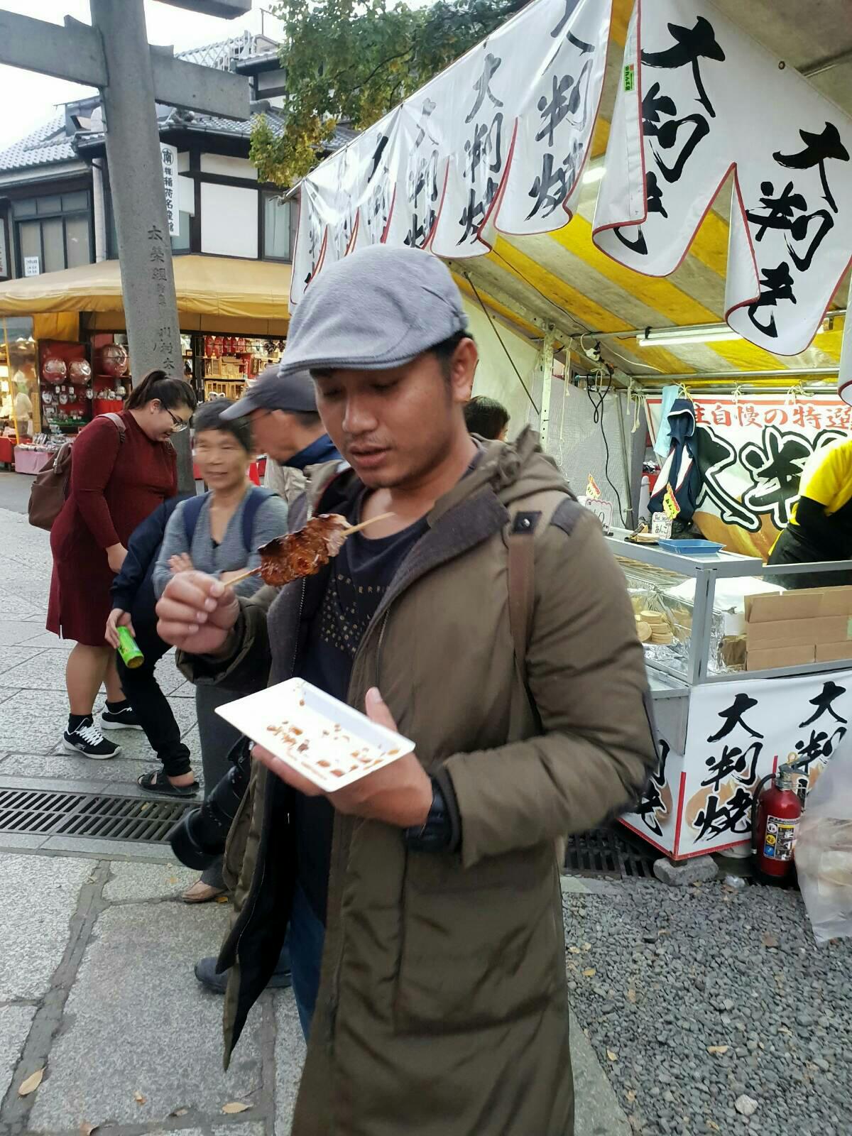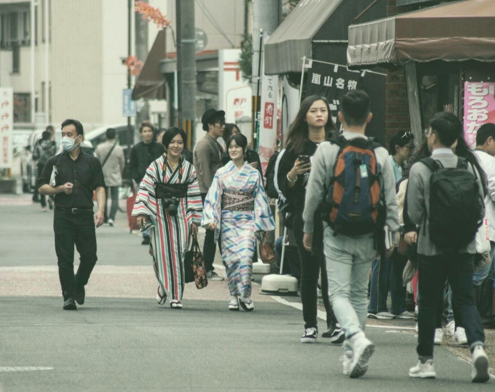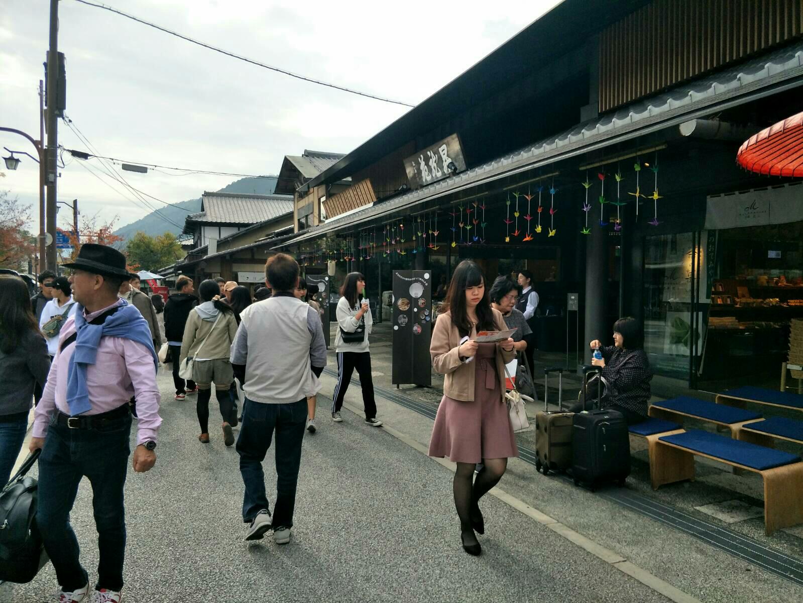 พอมาถึงสถานี Saga-Arashiyama ครับ เราก็เดินออกจากสถานีรถไฟแล้วก็เดินไปยังวัด Tenryji ครับ แต่แล้วแผนก็เปลี่ยนครับ เพราะเราเริ่มหิวแล้ว 555 ก็เลยเดินทางตามถนน หาของกินดิครัช 555 บรรยากาศก็จะประมาณนี้ครับ คนเยอะครับ