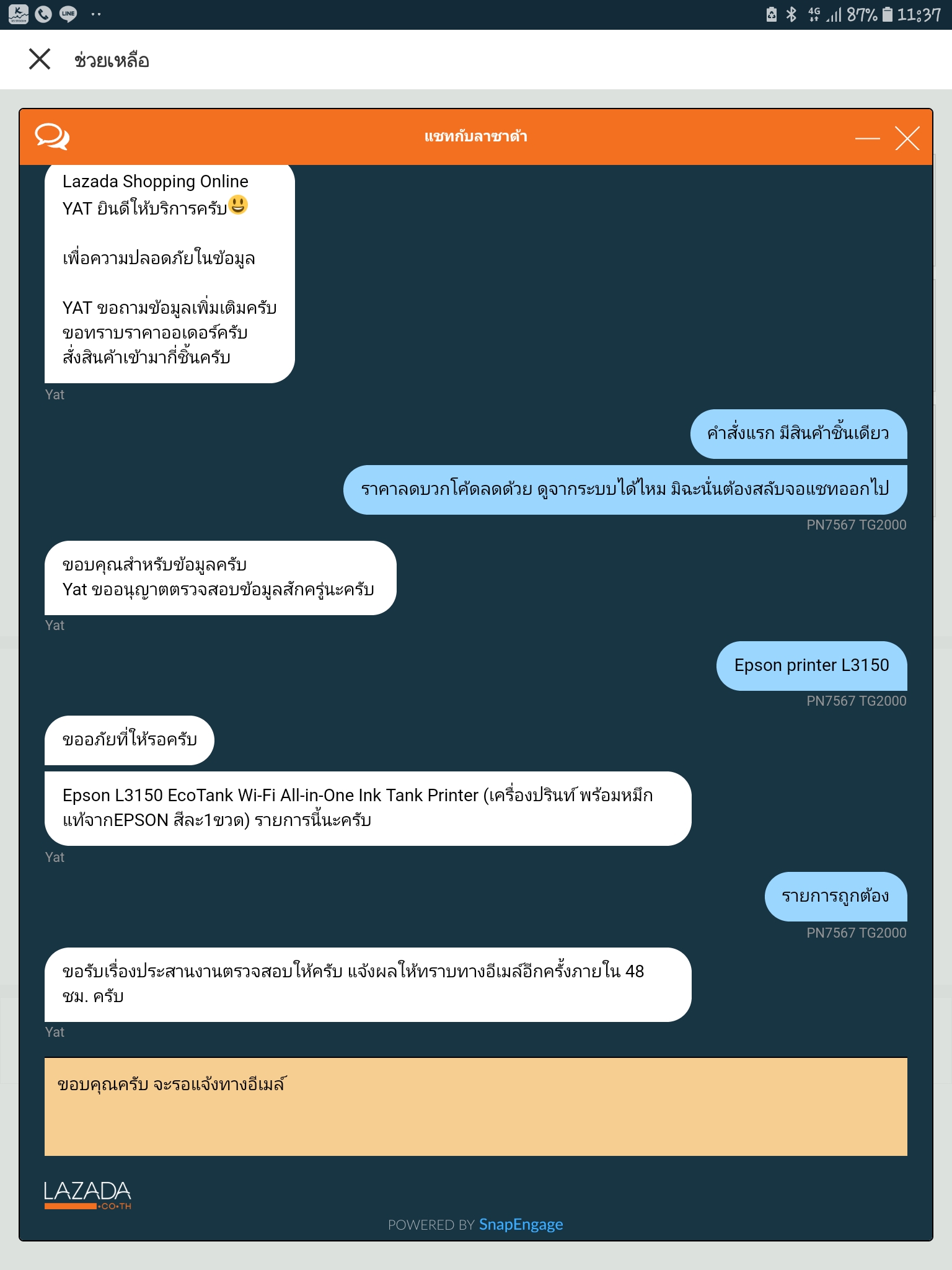 ตรวจสอบหลังไมค์ ก็เหมือนว่า คุณ Lazada Thailand Official ก็เงียบไป ส่วนของคุณ YAT จาก Chat ก็เงียบไป