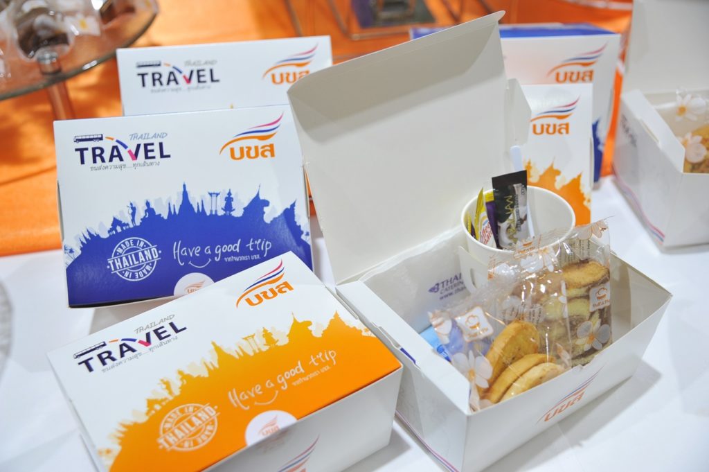 นายวิวัฒน์ ปิยะวิโรจน์ รองกรรมการผู้อำนวยการใหญ่สายการพาณิชย์ รักษาการรองกรรมการผู้อำนวยการใหญ่หน่วยธุรกิจบริการการบิน บริษัท การบินไทยฯ เปิดเผยว่า บริษัท การบินไทย จำกัด (มหาชน) โดยฝ่ายครัวการบินมีความยินดีที่ได้รับความไว้วางใจจากบริษัท ขนส่ง จำกัด ให้เป็นผู้ผลิตอาหารกล่องและเครื่องดื่มเพื่อให้บริการผู้โดยสารบนรถโดยสารปรับอากาศ ชั้น 1 โดยจะผลิตอาหารกล่องซึ่งในแต่ละกล่องบรรจุขนมไทย และ ขนมเบเกอรี่หรือขนมทั่วไป พร้อมเครื่องดื่มเพื่อจัดส่งให้แก่บริษัท ขนส่ง จำกัด นอกจากนี้ฝ่ายครัวการบินจะผลิตอาหารกล่องบรรจุขนมเมนูพิเศษที่สอดคล้องกับเทศกาลสำคัญต่างๆ รวมทั้งเส้นทางเดินรถไปในแต่ละภูมิภาค เช่น พายไส้อั่ว เพื่อให้บริการในเส้นทางสู่ภาคเหนือ หรือขนมปังไส้ไก่ ที่มีรสชาติจัดจ้าน ให้บริการในเส้นทางสู่ภาคใต้ เป็นต้น โดยเมนูเบเกอรี่ที่ให้บริการทั้งหมดจะเป็นเบเกอรี่ฮาลาล ซึ่งผู้โดยสารทุกท่านสามารถรับประทานได้