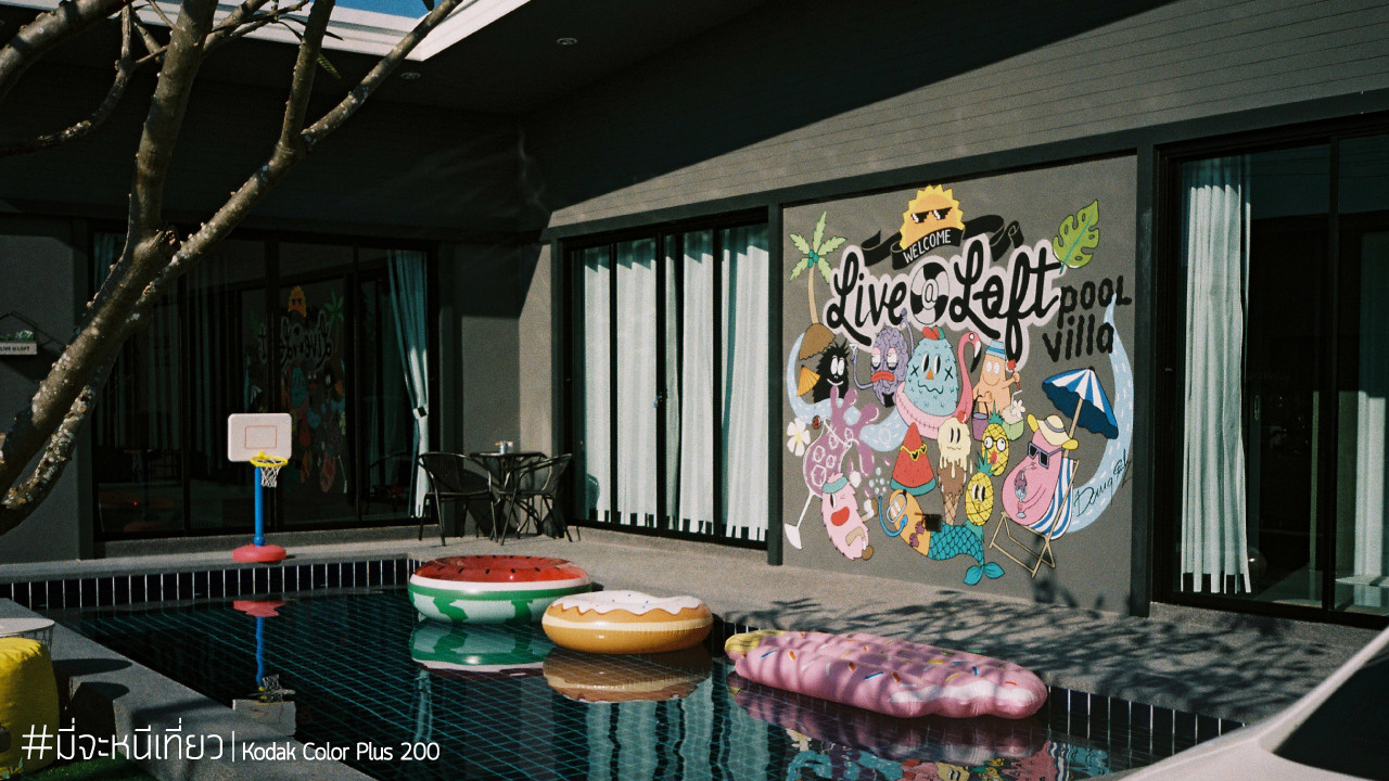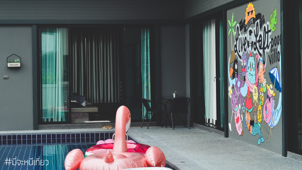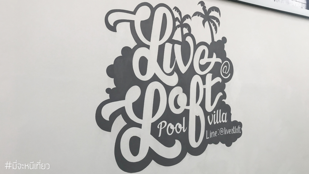มาถึงที่พักแล้ว ทริปนี้เรามาพักกันที่ Live @ Loft Pool Villa เป็นบ้านพัก Pool Villa ที่ชิคและเก๋มาก สไตล์ Loft ตกแต่งด้วยลายเพ้นท์ Graffiti เท่ๆ ทุกมุมคือถ่ายรูปออกมาได้สวยจริงๆ