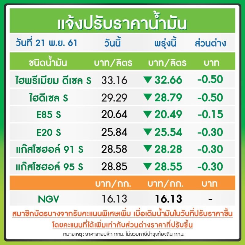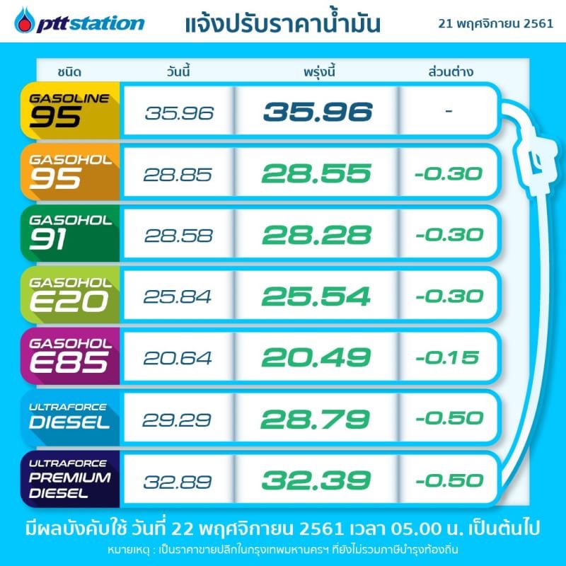 แจ้งปรับลดราคาน้ำมันขายปลีก มีผลพรุ่งนี้ ตี 5 (วันที่ 22 พ.ย. 61 เวลา 5.00 น.)