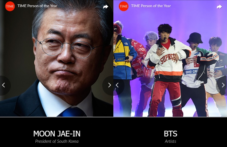 TIME หนังสือหัวใหญ่ชื่อดังที่จัดอันดับบุคคลผู้ทรงอิทธิพลทั่วโลก และจัดอันดับบุคคลแห่งปีมาตั้งแต่ปี 1927 ได้มีการประกาศรายชื่อผู้เข้าชิงบุคคลแห่งปี 2018 ซึ่งวัดจากความอิมแพคที่เกิดขึ้นในปี 2018 ทั่วโลกและสองตัวแทนจากเกาหลีใต้ที่ได้เข้าชิงคือ ประธานาธิบดีมุนแจอิน กับ BTS