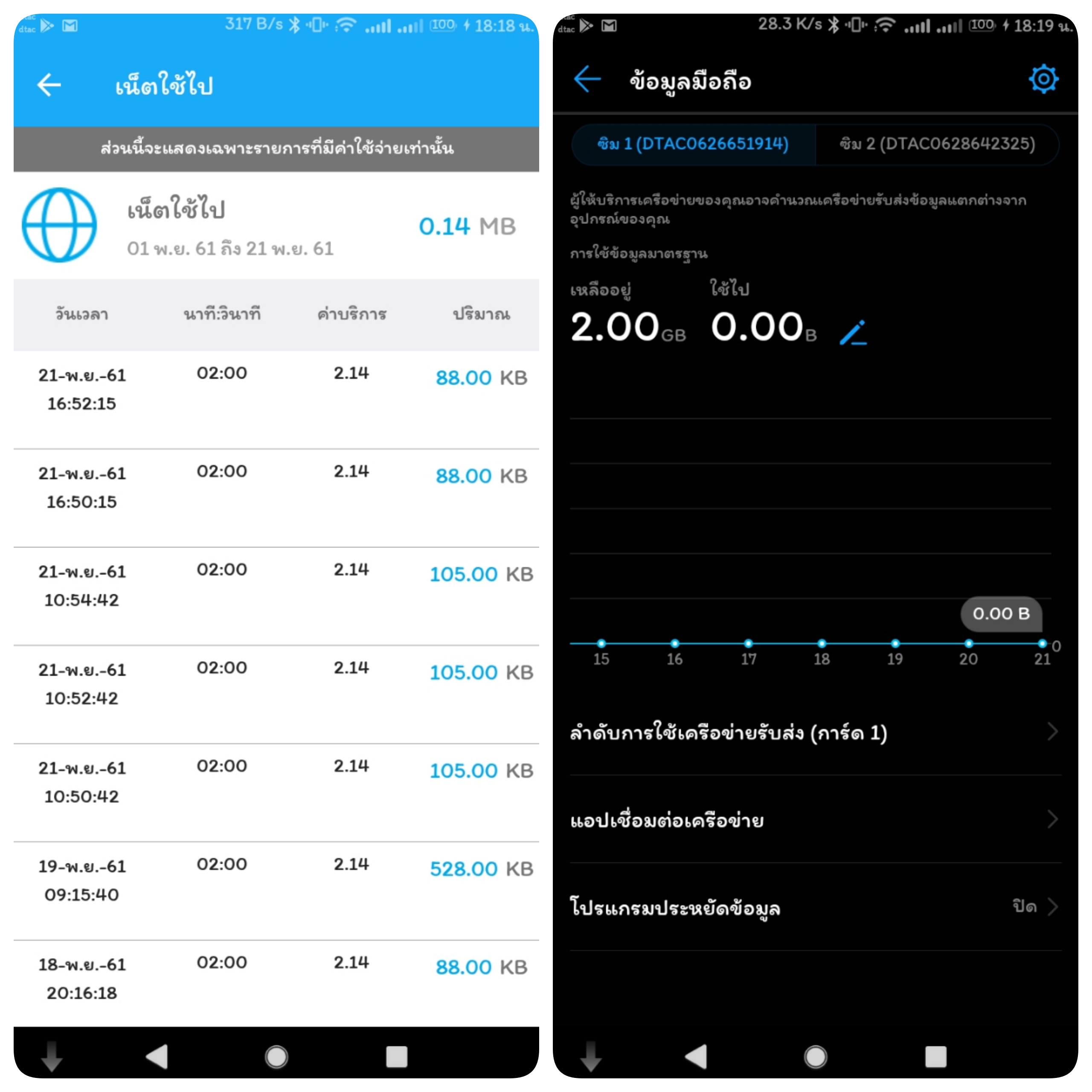 ตามภาพจะเห็นว่ามีการหักค่าใช้งานอินเตอร์เน็ตเรื่อยๆ ทีละ 2.14 บาท มาตลอด แต่ไม่ได้เปิดใช้เน็ตนะครับ โทรศัพท์ก็ไม่มีข้อมูลบันทึกว่ามีการใช้อินเตอร์เน็ตด้วย งงเลยครับ
