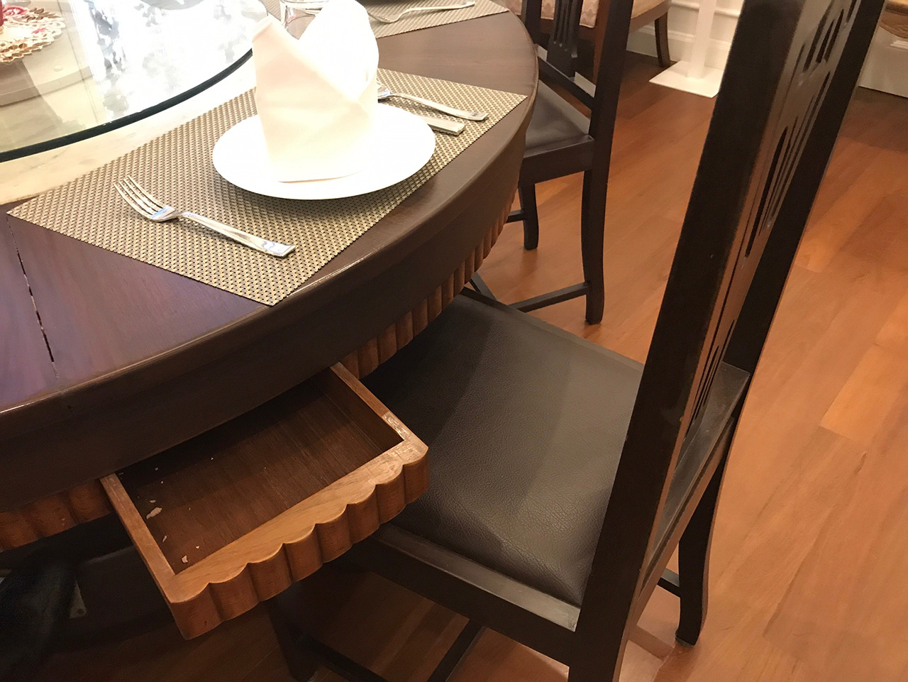 ห้องอาหารโต๊ะกลม เป็นโต๊ะไม้สัก มีกลไกทำให้โต๊ะหมุนได้ กลไกอยู่ที่ขาโต๊ะ