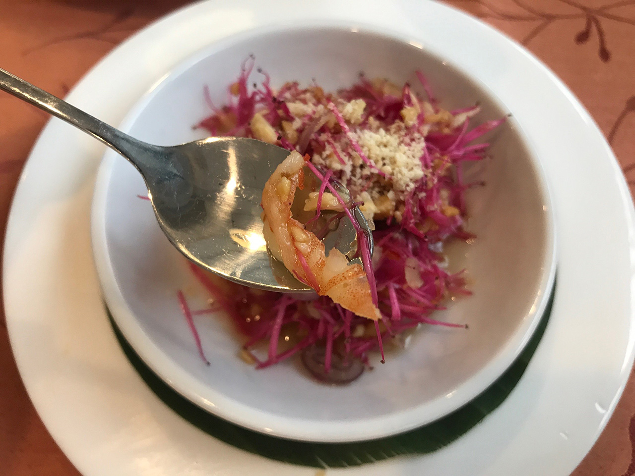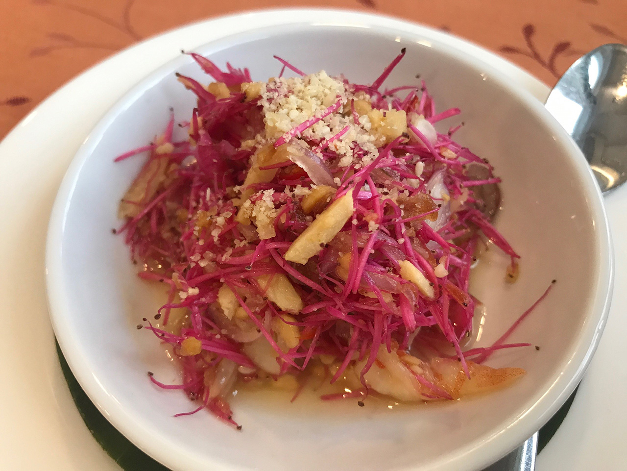 ส่วนจานนี้เป็นของแถม คือ ยำเกสรดอกชมพู่มะเหมี่ยว รสชาติอร่อย กลมกล่อม คล้ายๆยำ ตัวเกสรก็หวานกรอบ สาเหตุที่ไม่มีขายเพราะตัวเกสรดอกชมพู่มะเหมี่ยวมาจากชมพู่ที่ทางร้านปลูกเองแบบออร์แกนิค ซึ่งมีจำนวนไม่มาก ถ้าลูกค้ามาจังหวะที่ลูกชมพู่ออกพอดี ทางร้านจะทำมาให้ทานกันฟรีๆ