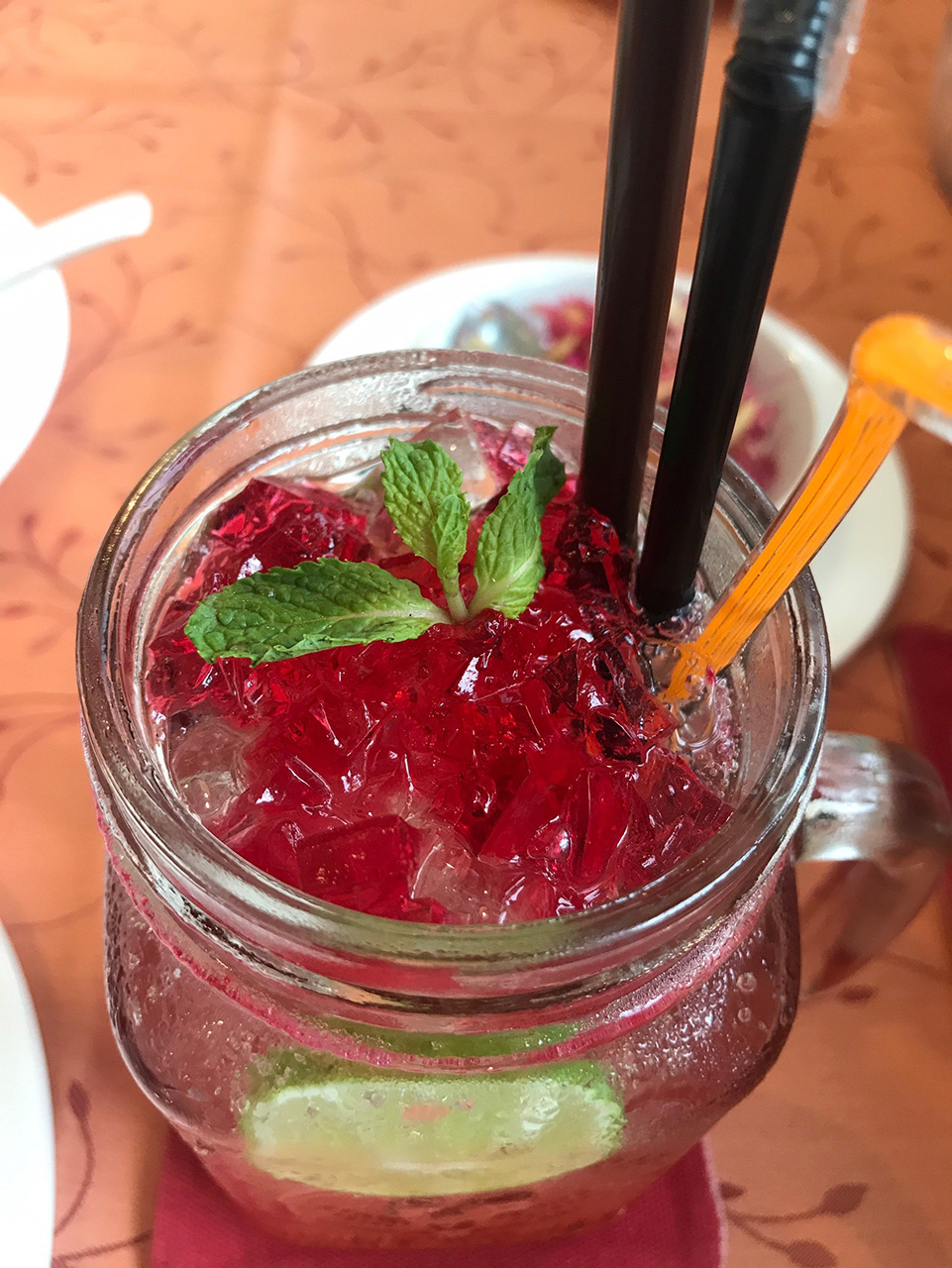 ด้านบนเป็นเหมือนเยลลี่ (จริงๆผมไม่รู้ว่ามันคืออะไรนะ ขอเรียกว่าเนื้อเยลลี่แล้วกัน) ผู้จัดการร้านแนะนำให้คนให้ทั่วก่อนทาน กลิ่มหอมชวนกิน รสชาติหวานนิดเปรี้ยวหน่อย และเหมือนมีความซ่าของโซดา ดูดแล้วชื่นใจมาก เนื้อเยลลี่ก็อร่อย ผมลองถามทางผู้จัดการร้านว่ามีส่วนผสมของอะไรบ้าง ได้คำตอบว่า ดอกมะลิ กุหลาบมอญ กะดังงา และอื่นๆที่เป็นสูตรทางร้านไม่สามารถเปิดเผยได้ เป็นเมนูเครื่องดื่มที่แนะนำให้สั่งทานครับ