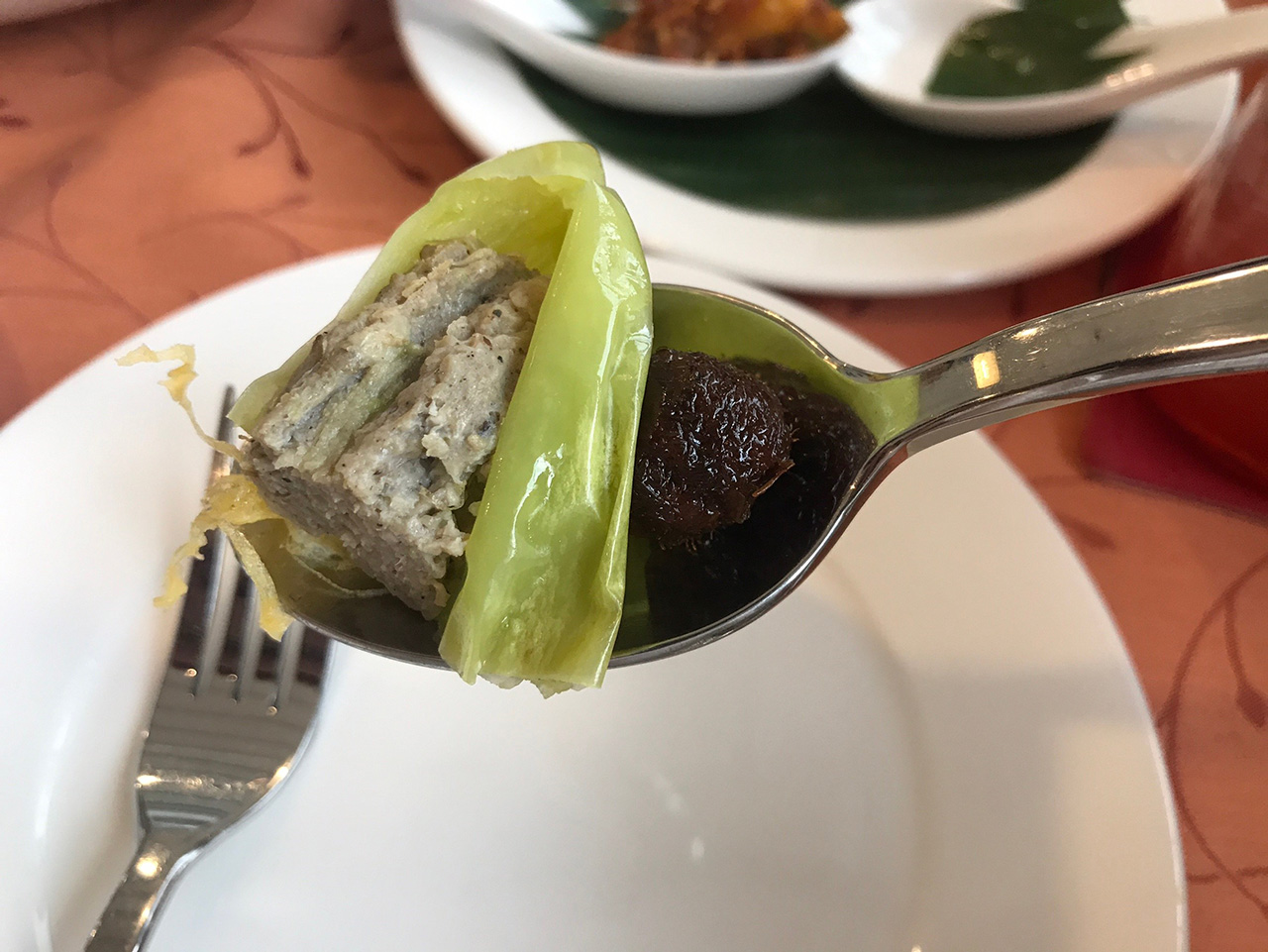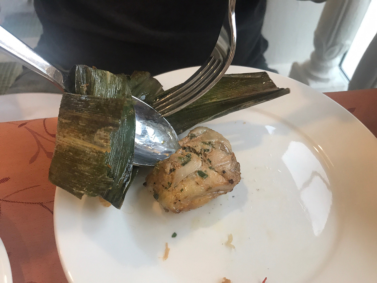 ใช้ใบเตยแท้ ๆ ในการทำ ส่วนไก่ใช้ชิ้นส่วนสะโพก เนื้อไก่นุ่มมาก กัดไปแทบไม่ต้องเคี้ยวเลย มีรสเครื่องเทศอ่อนๆ น้ำจิ้มที่เสิร์ฟมาพร้อมกันขอบอกเลยอร่อยมาก หอม เข้มข้ม มีความหวานนิดๆ นอกจากจิ้มไก่แล้ว ผมยังเอาไปจิ้มอาหารอื่น ๆ อีก เพราะมันอร่อยจริงๆนะ