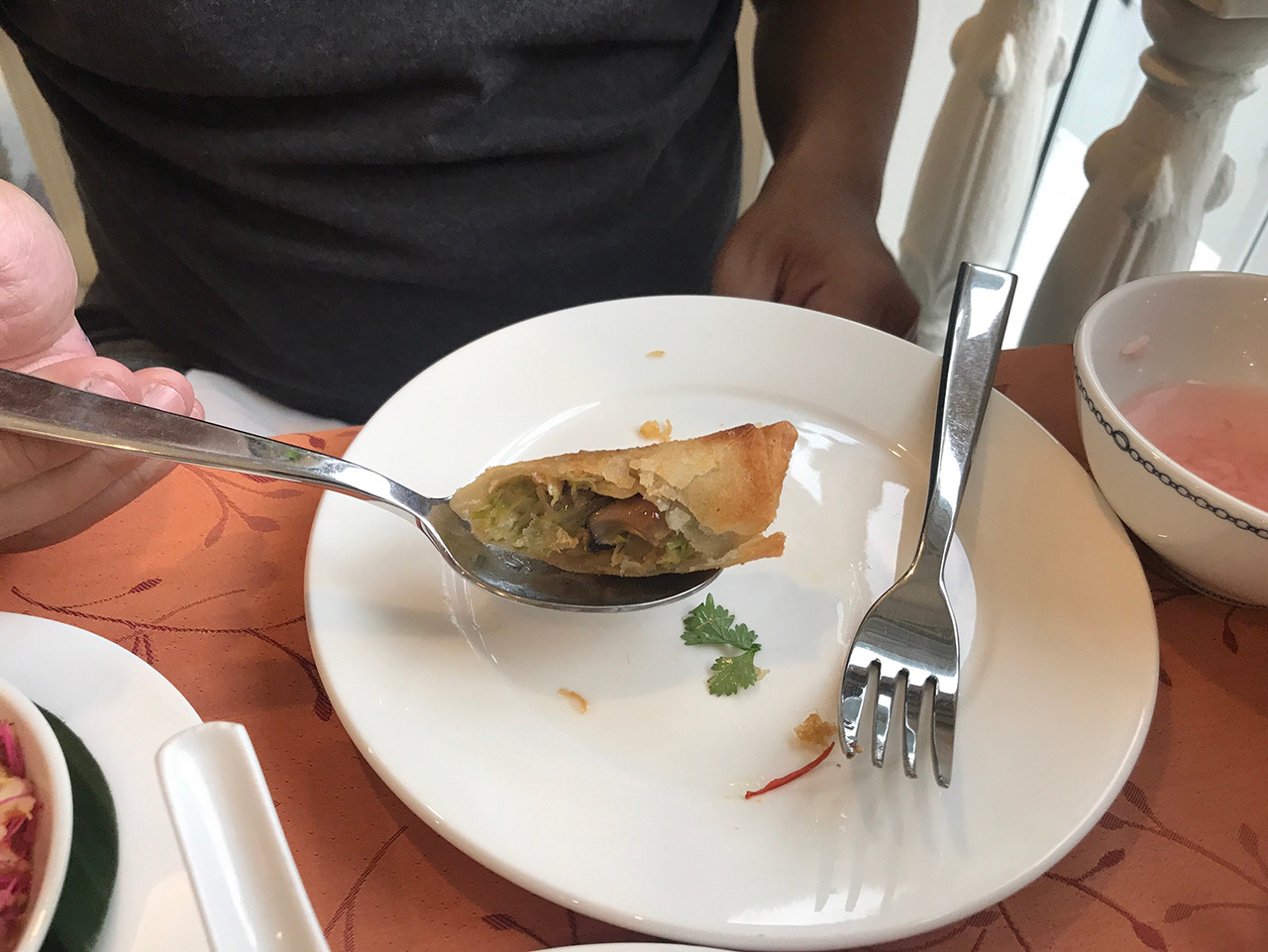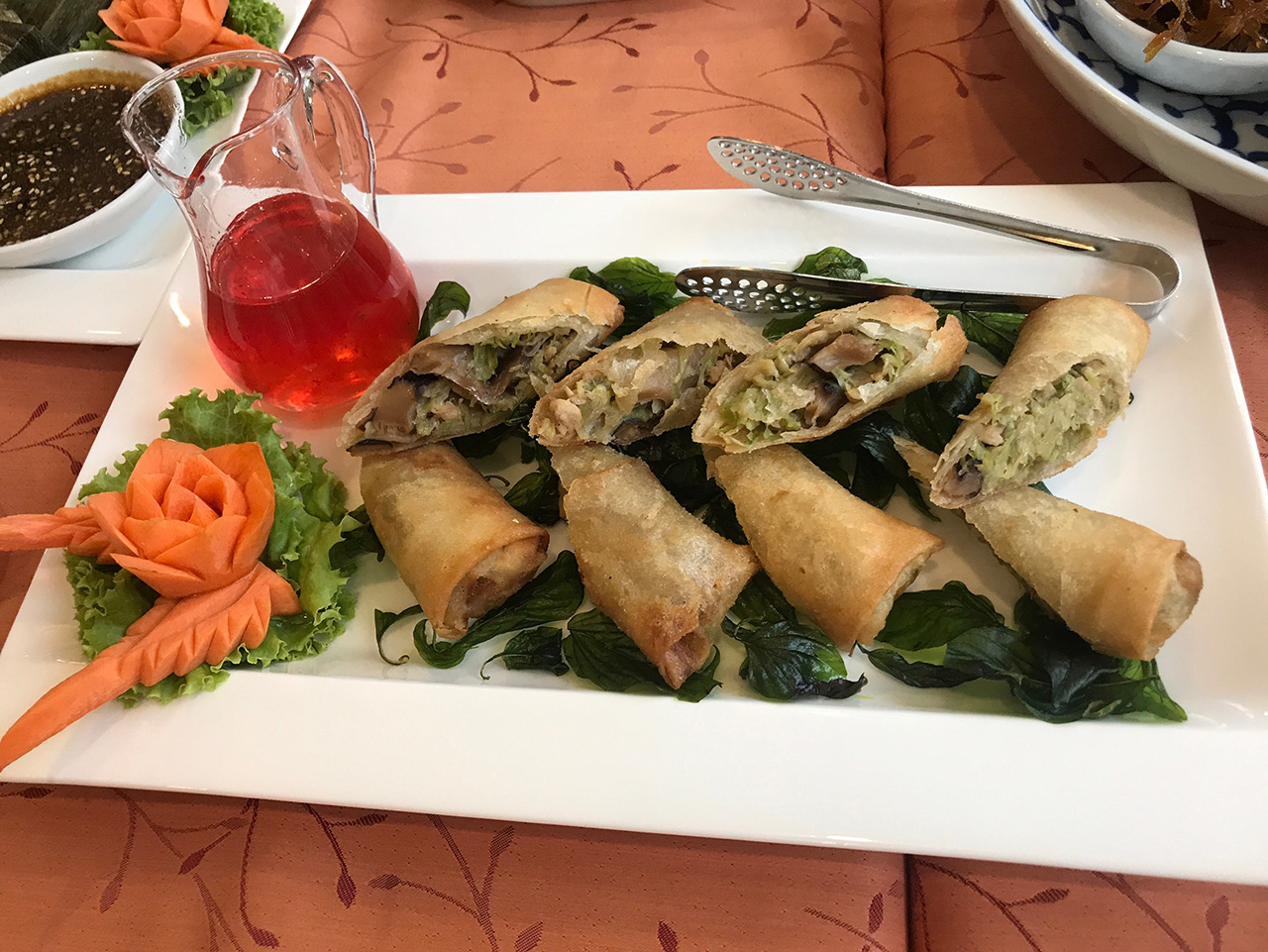 แป้งกรอบอร่อย รสเข้มข้น มีกลิ่นเครื่องเทศอ่อน ๆ ไส้แน่นๆ ตัวไส้เป็นเห็ดหอมและผัก ไม่มีวุ้นเส้นแบบปอเปี๊ยะทั่ว ๆ ไป เสิร์ฟพร้อมน้ำจิ้มในโถแก้ว น้ำจิ้มสีออกแดงๆเพราะมีส่วนผสมของน้ำอุทัยหมอมี น้ำจิ้มรสออกหวานหน่อย เมื่อกินกับปอเปี๊ยะจะได้รสกลมกล่อมพอดีๆ กินเล่นเพลินๆ