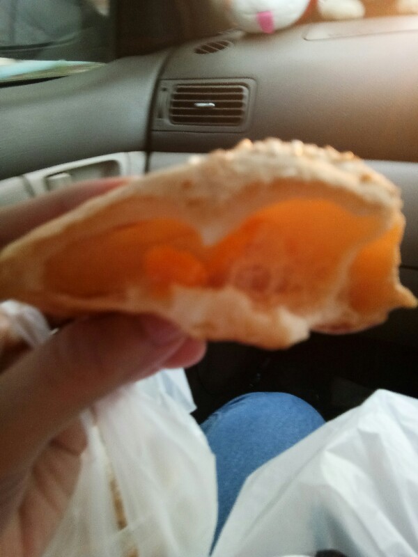 ซื้อเสร็จก็จ่ายเงินไป ขึ้นรถก็แกะไอ้เจ้าโมจิไข่เค็มนี้กิน (ชื่อจริงๆ มันคืออะไรไม่แน่ใจนะคะ ในบิลนั้นน่าจะเป็นไส้นม แต่เราหยิบไส้ไข่เค็มมาค่ะ)