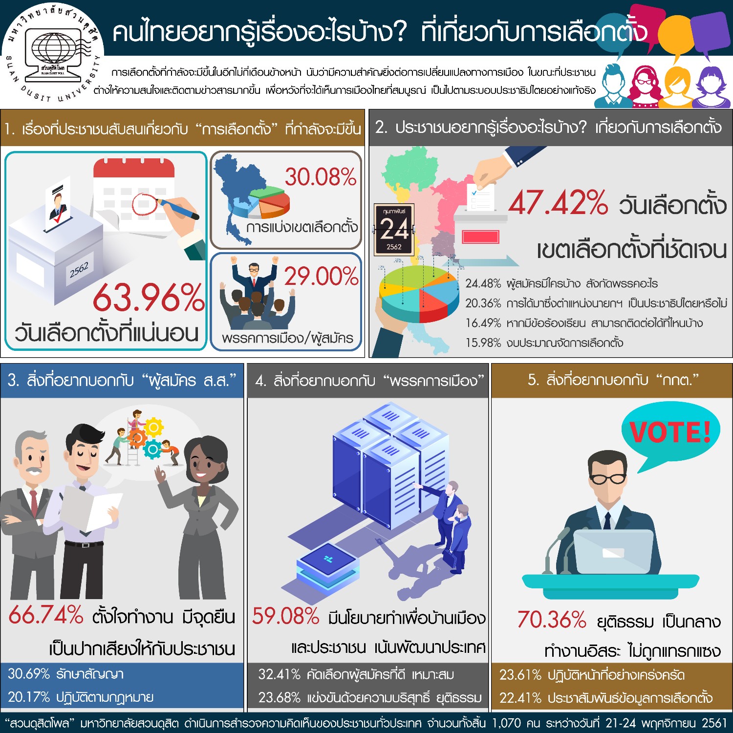 การเลือกตั้งที่กำลังจะมีขึ้นในอีกไม่กี่เดือนข้างหน้า นับว่ามีความสำคัญยิ่งต่อการเปลี่ยนแปลงทางการเมือง ในขณะที่ประชาชนต่างให้ความสนใจและติดตามข่าวสารมากขึ้น เพื่อหวังที่จะได้เห็นการเมืองไทยที่สมบูรณ์ เป็นไปตามระบอบประชาธิปไตยอย่างแท้จริง เพื่อสะท้อนความคิดเห็นของประชาชนเกี่ยวกับการเลือกตั้ง “สวนดุสิตโพล” มหาวิทยาลัยสวนดุสิต ได้ดำเนินการสำรวจความคิดเห็นของประชาชนทั่วประเทศ จำนวนทั้งสิ้น 1,070 คน ระหว่างวันที่ 21-24 พฤศจิกายน 2561