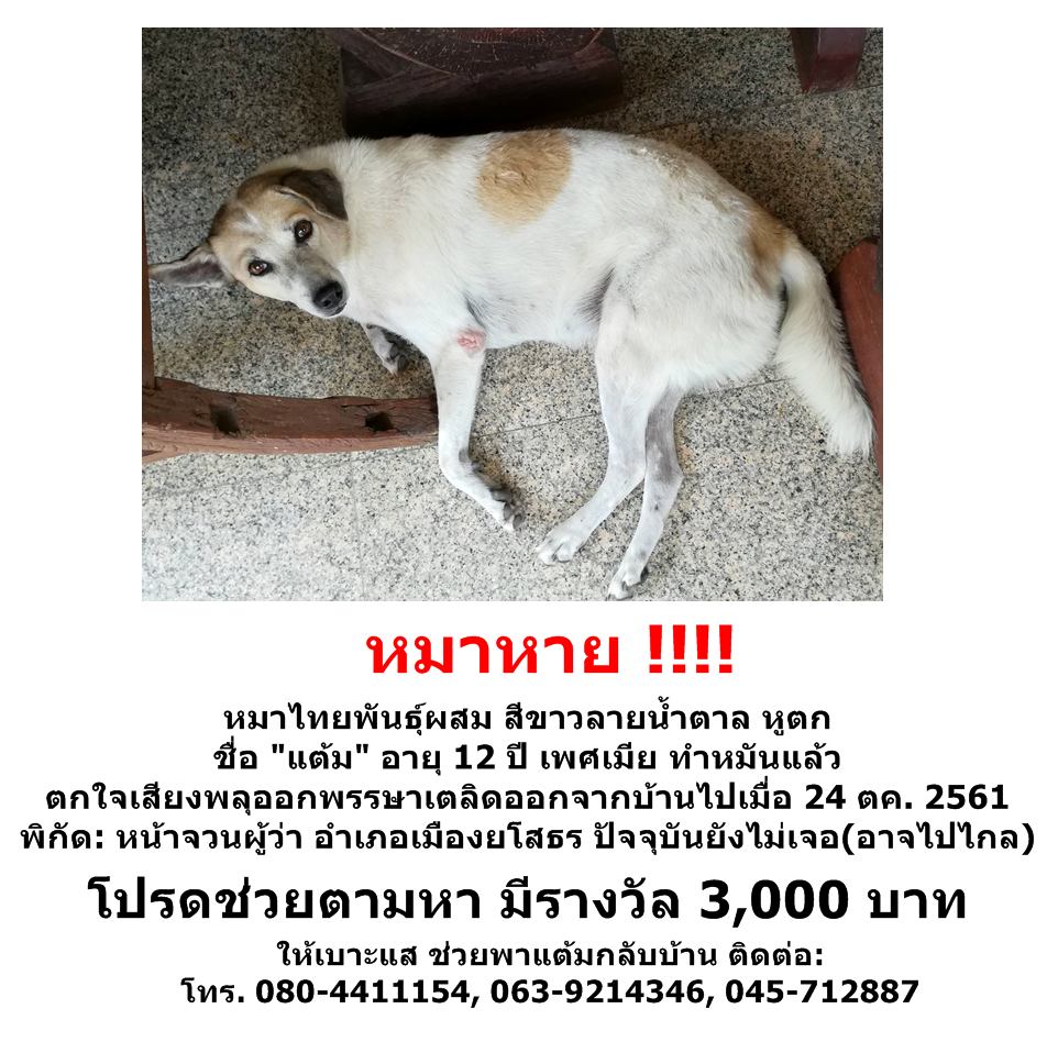 หมาหาย !!!!!!!!!!!! หมาไทยพันธุ์ผสม หายที่จ.ยโสธร หรือจังหวัดข้างเคียง ได้โปรดช่วยตามหา!!!!!