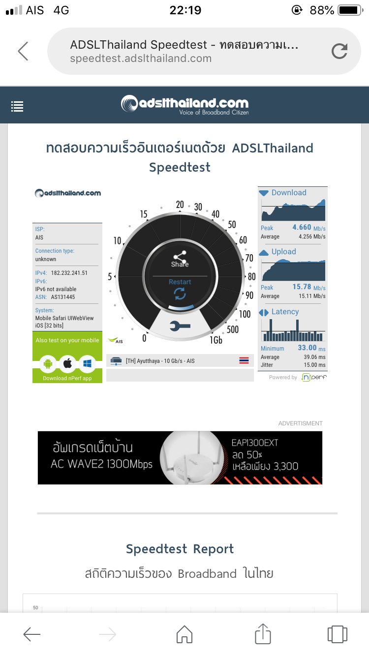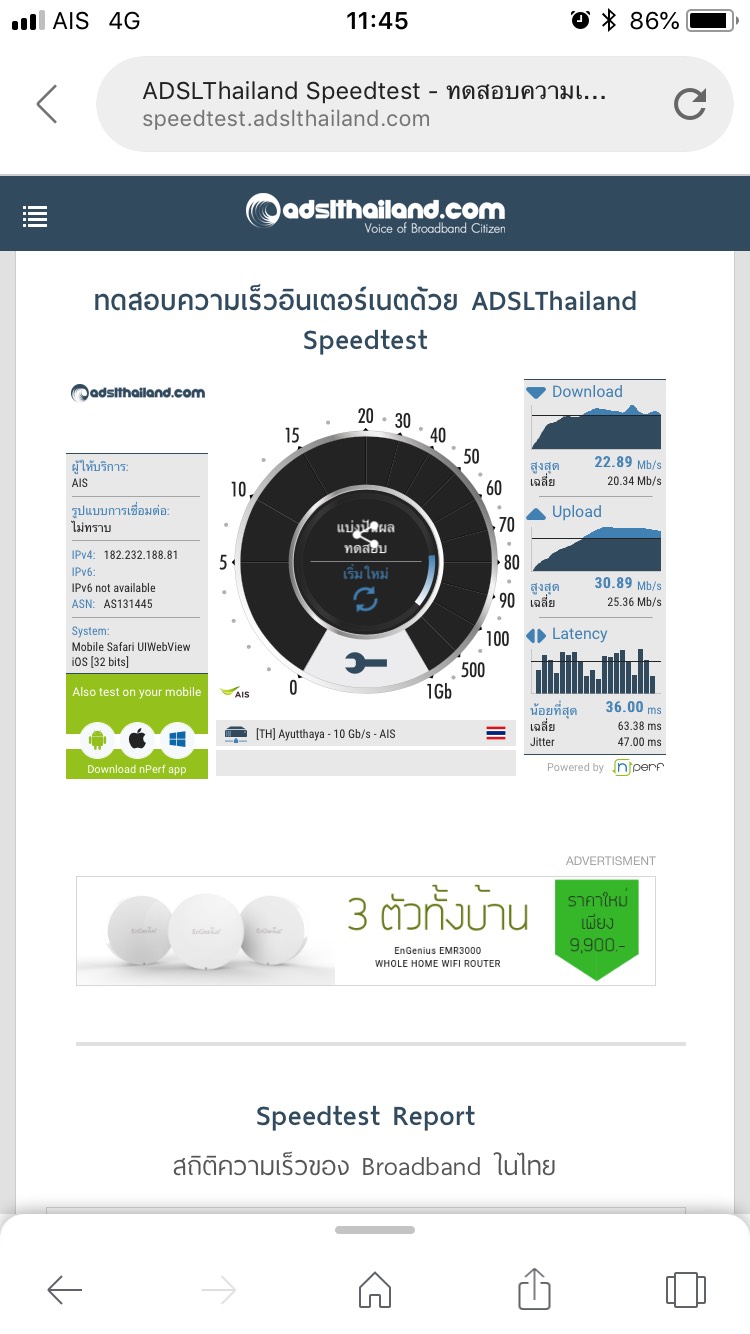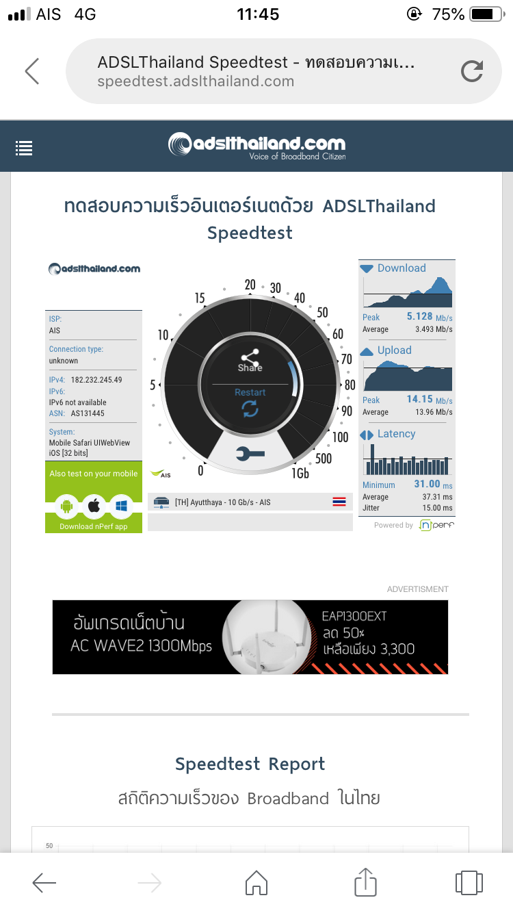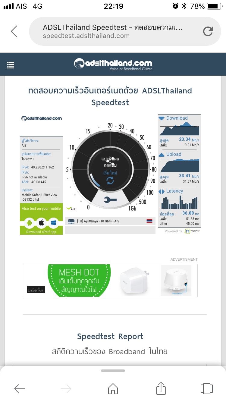 เนื่องจากผมได้ใช้เครือข่าย Ais และรู้สึกว่า Internet ช้ามากๆ เล่นเกมยังกระตุก และได้โืทรสอบถาม CC แล้ว (วันที่ 6/11/18) ซึ่งทาง CC ได้ดำเนินการจะส่งวิศวะกรเข้ามาตรวจสอบในพื้นที่ที่อยู่ จนกระทั่งวันที่ 22/11/18 ได้ส่งข้อความมาบอกว่าดำเนินการเรียบร้อยแล้วให้กดโทรที่เบอร์ *1175*78 แล้วผลบอกว่าพื้นที่ที่อยู่สัญญาณปกติ ผมก็ยังรู้สึกว่าช้าอยู่ดี