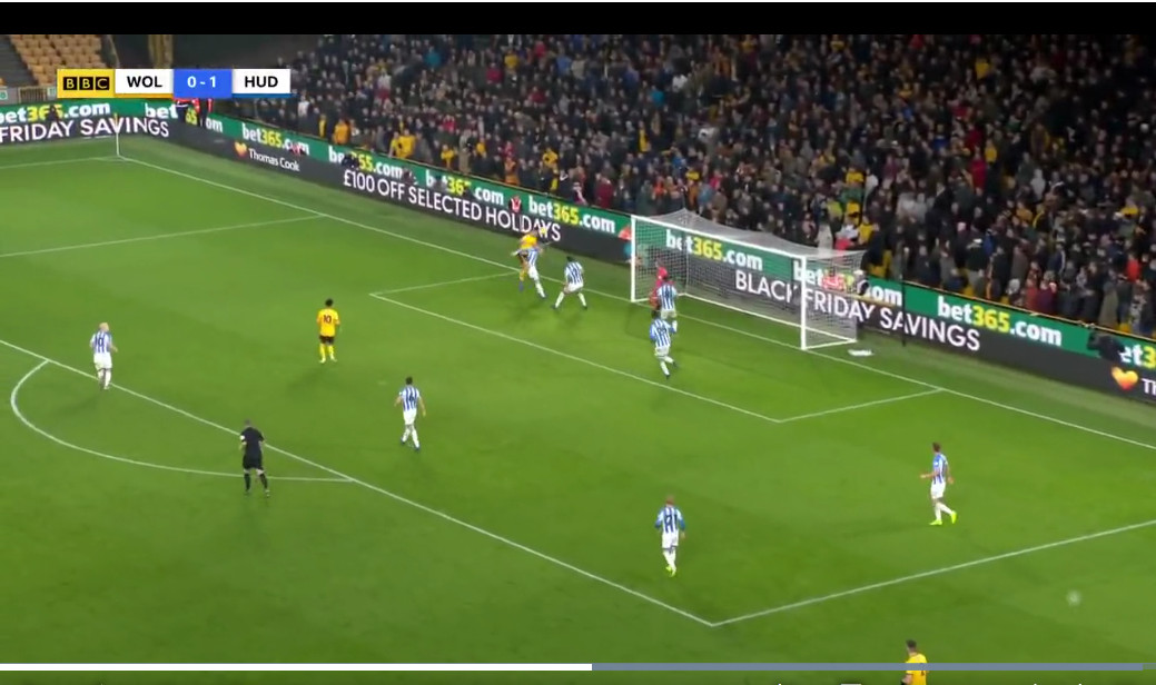 คู่ Wolverhampton-Huddersfield วูฟฟ์โหม่งลูกบอลเข้าในประตูเกือบทั้งลูกแล้ว เหลืออีกเพียง 1.8 ซม.
