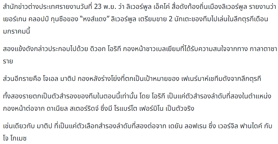 สื่อดังท้องถิ่นรายงานว่า เยอร์เกน คลอปป์ ไฟเขียวปล่อยตัว 2 แข้งลิเวอร์พูลออกจากถิ่นแอนฟิลด์เดือนมกราคมนี้ งานเข้าแล้ว เมื่อคล็อปไม่สามารถปั้นโอริกี้ให้เป็นAubameyang สมัยคุมทีมดอร์ทมุนด์ และไม่สามารถปั้นมาติปให้เป็นHummelsหรือSchmelzer งานนี้ไม่มีอะไรมากพี่น้อง ขายโลด ขายอย่างเดียว