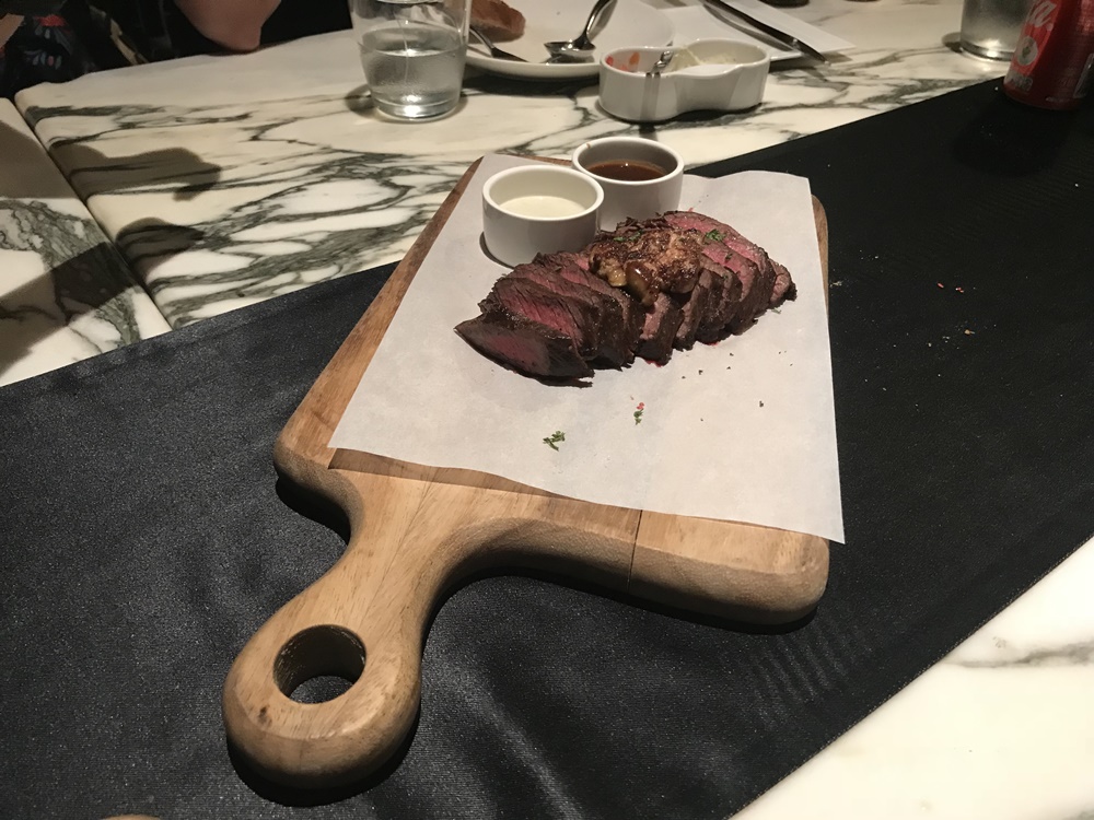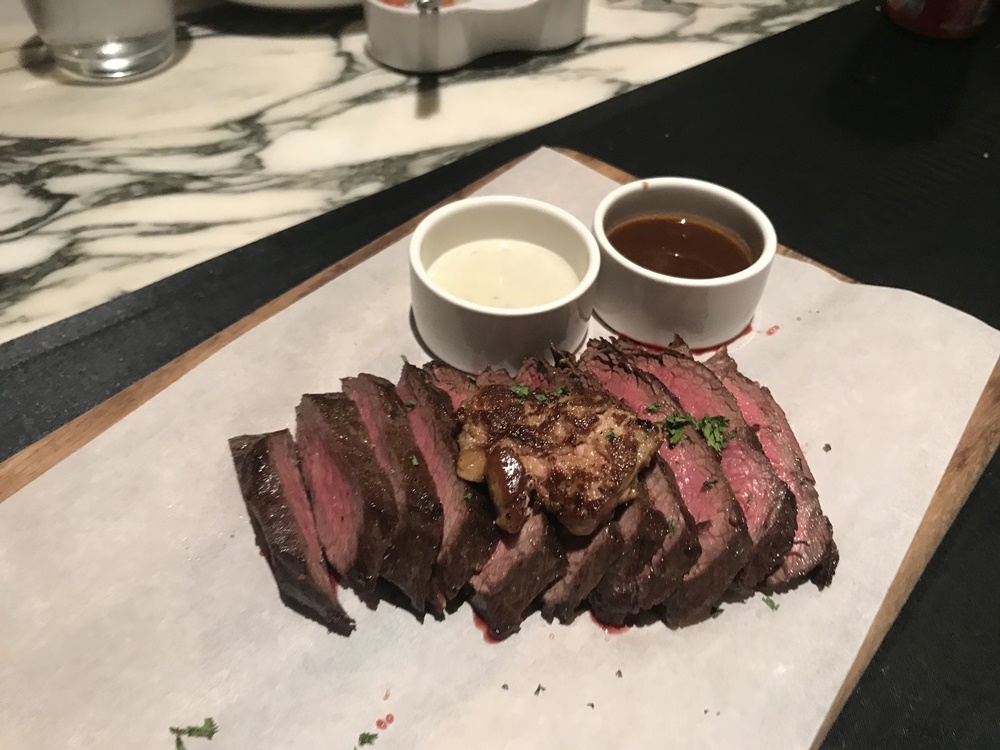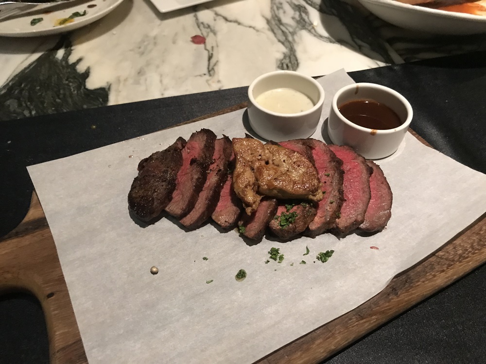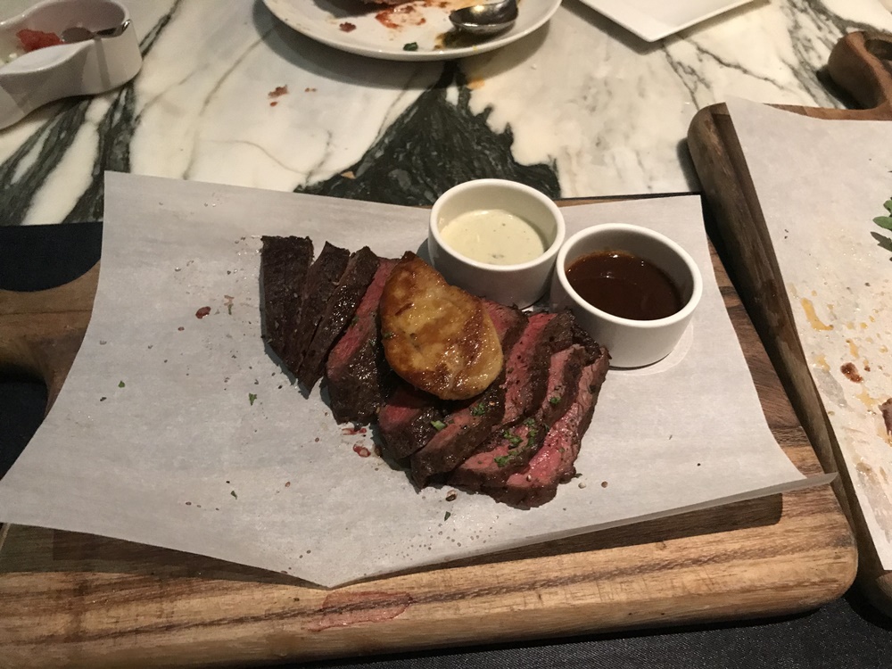 เป็นเนื้อAusie Angus ย่าง สุกกำลังดี จิ่มกับ blue cheeseและทรัฟเฟิ่ลซอซ อร่อย ครับ
