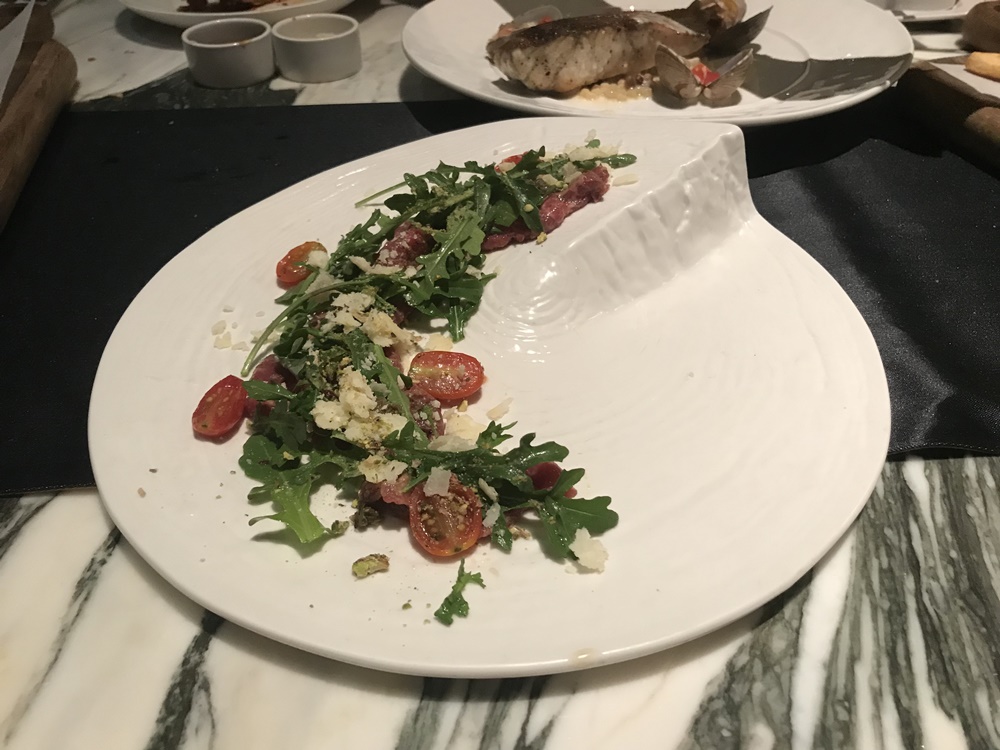 เนื้อสไลด์คลุกน้ำมันมะกอก กับ สลัดผัก จานนี้แต่งมาสวย รสชาติดีใช้ได้ กินเล่นๆเพลินๆ
