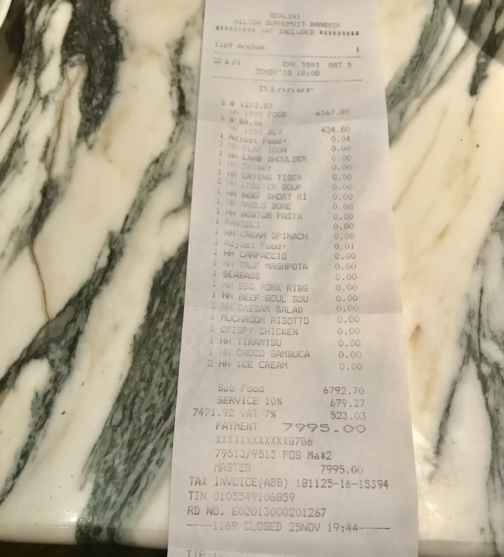 แม้จะลองบวกเมนูที่ทานกันไปห้าคนเล่นๆ ออกมาได้ 12,000 กว่าๆนิดเที่ยบกับบิลที่จ่ายไปจริง 8000