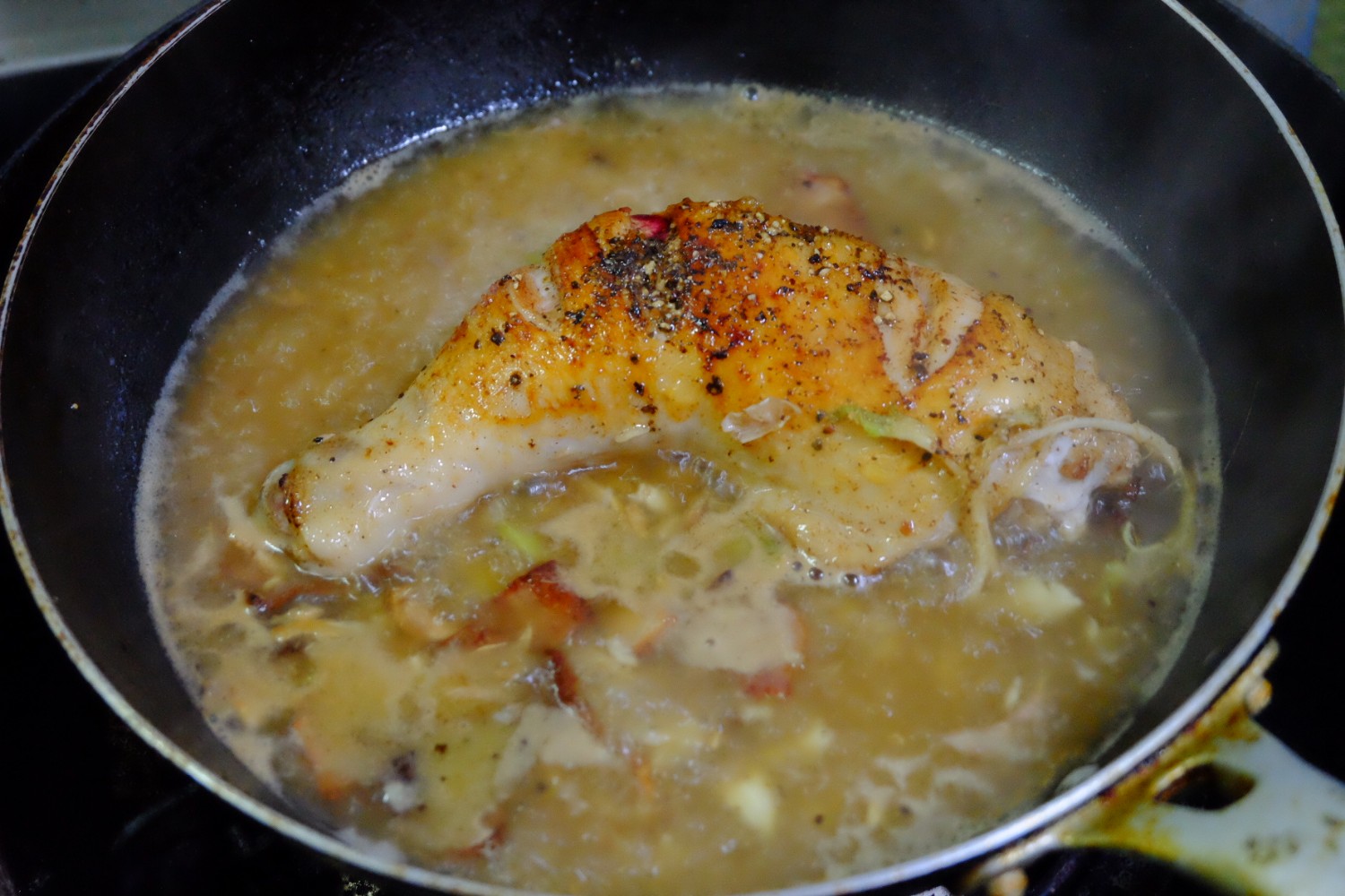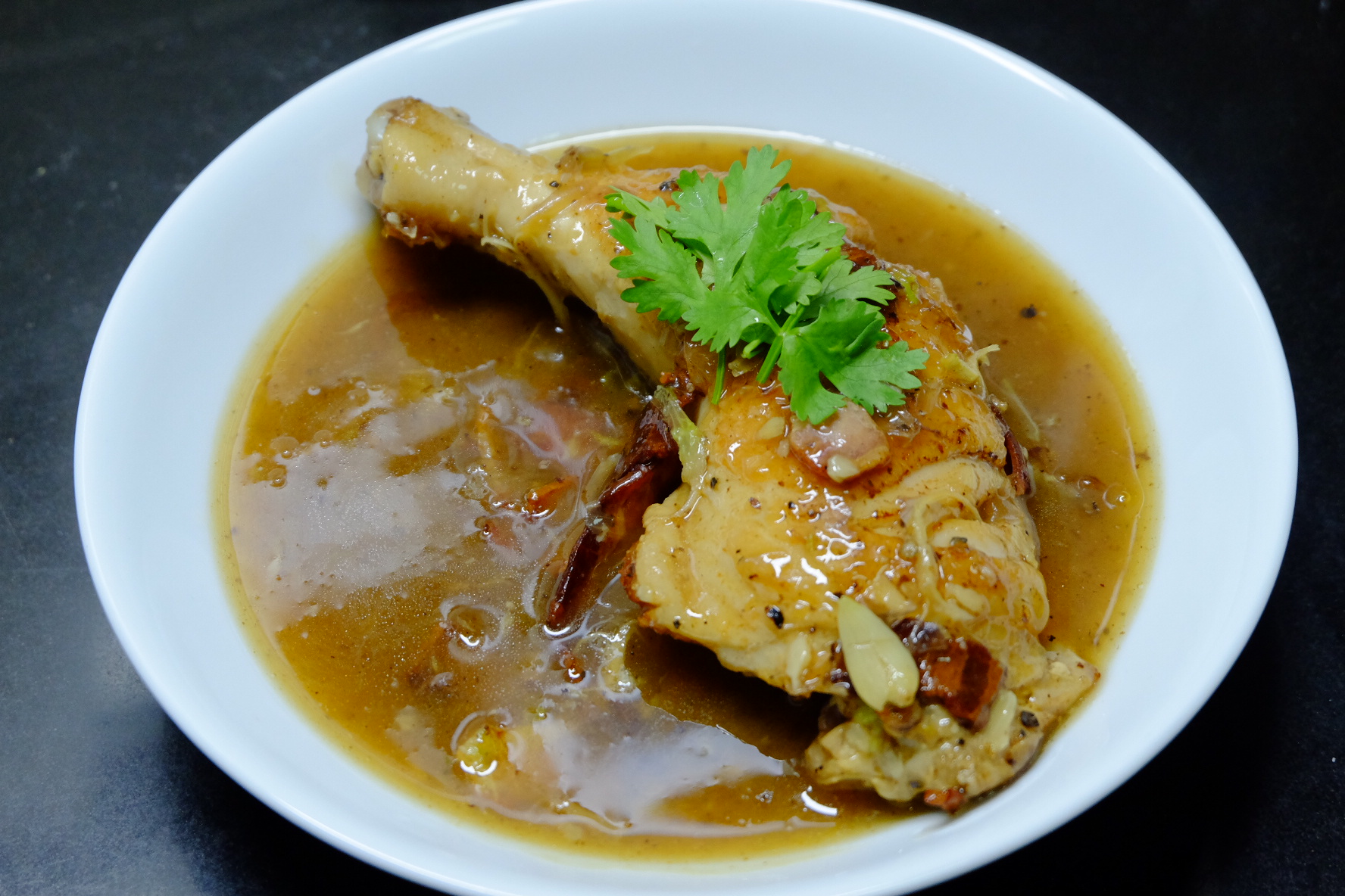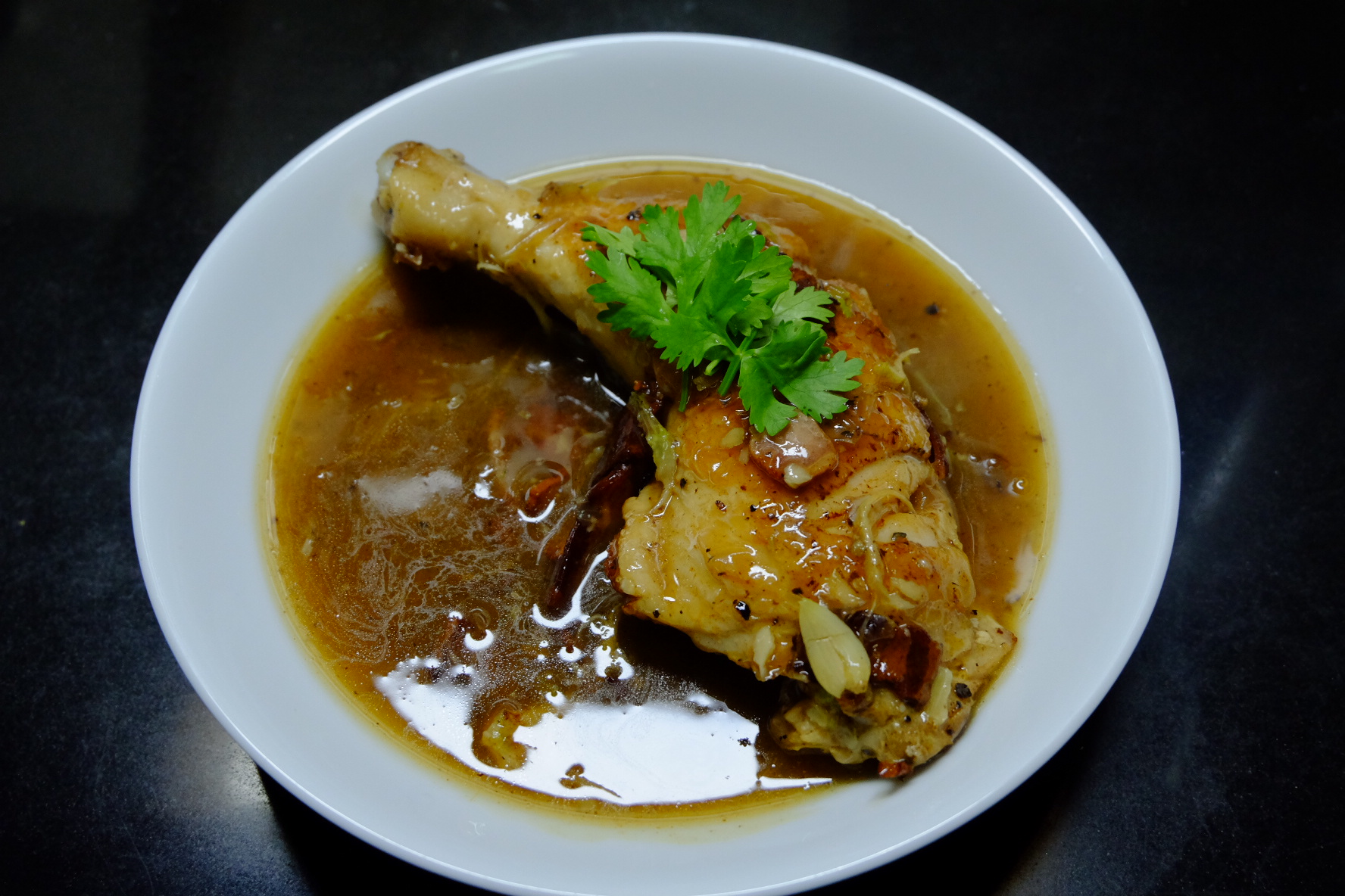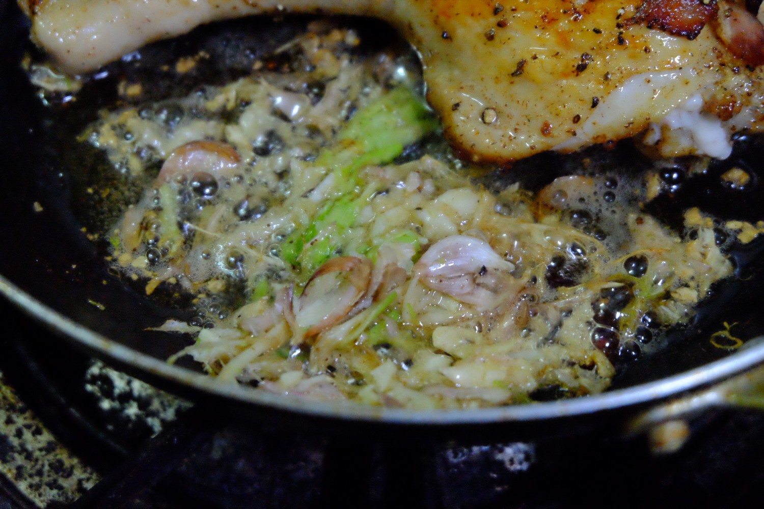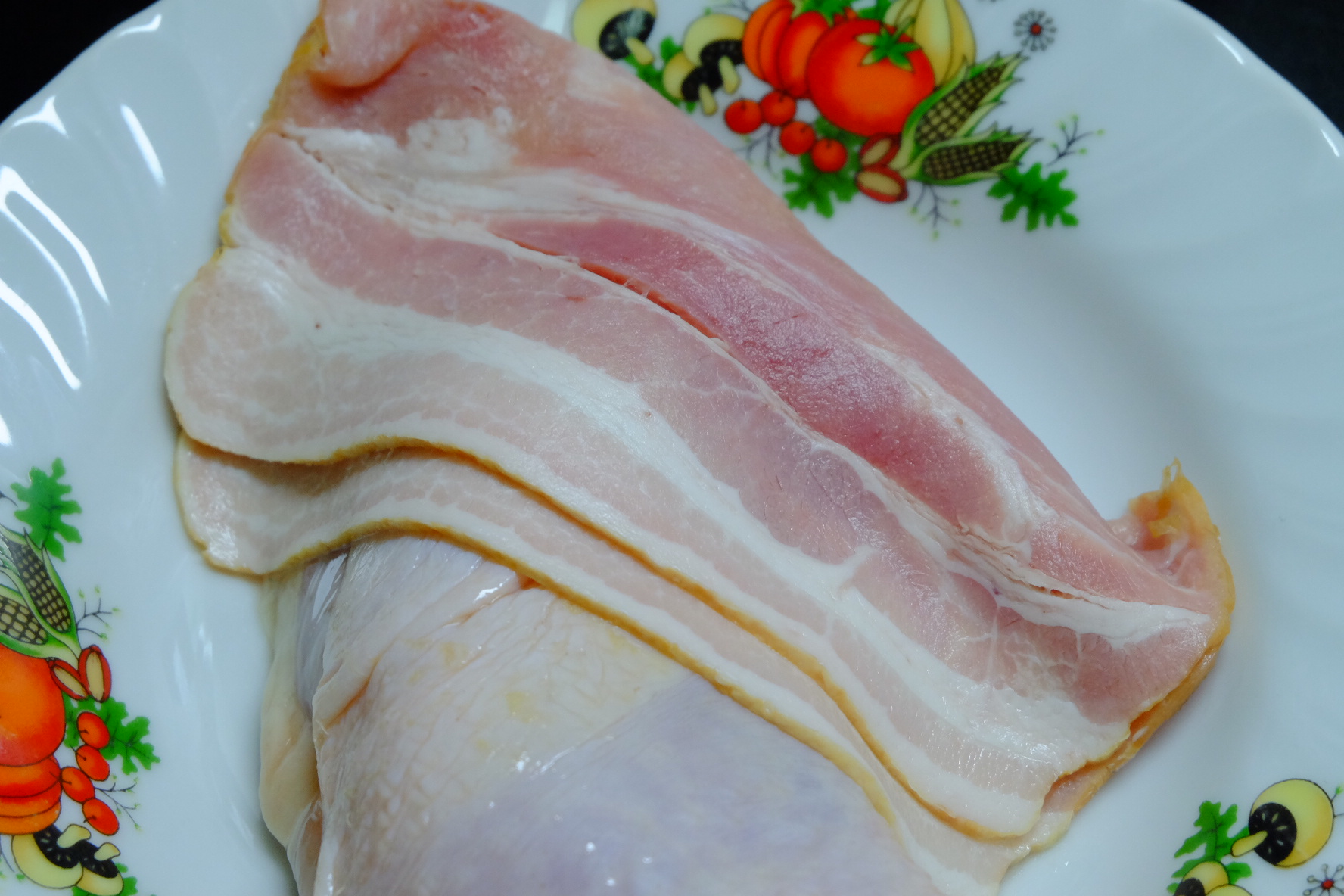 ผมใช้เบคอนไปเจียวกับเนย เพื่อให้หอม และกลิ่นจะออกสโม้คๆ นิดหน่อย แล้วก็จะไปผสมกับกลิ่นของกระเทียมกับรากผักชีที่เจียวลงไป แล้วเอาไปราดบนหนังไก่ จริงๆ เมนูนี้จะกินแบบไก่ทอดก็ได้เช่นกัน แต่อาจจะต้องเพิ่มความเค็มที่เนื้อไก่เอาสักหน่อย ใส่น้ำซุปลงไปก็จะเค็ม เพราะวันนี้ผมใช้ซุปก้อนซึ่งจะมีความเค็มอยู่แล้ว และเพิ่มมิริน เพิ่มหวานนิดหน่อยก็เพียงพอแล้ว