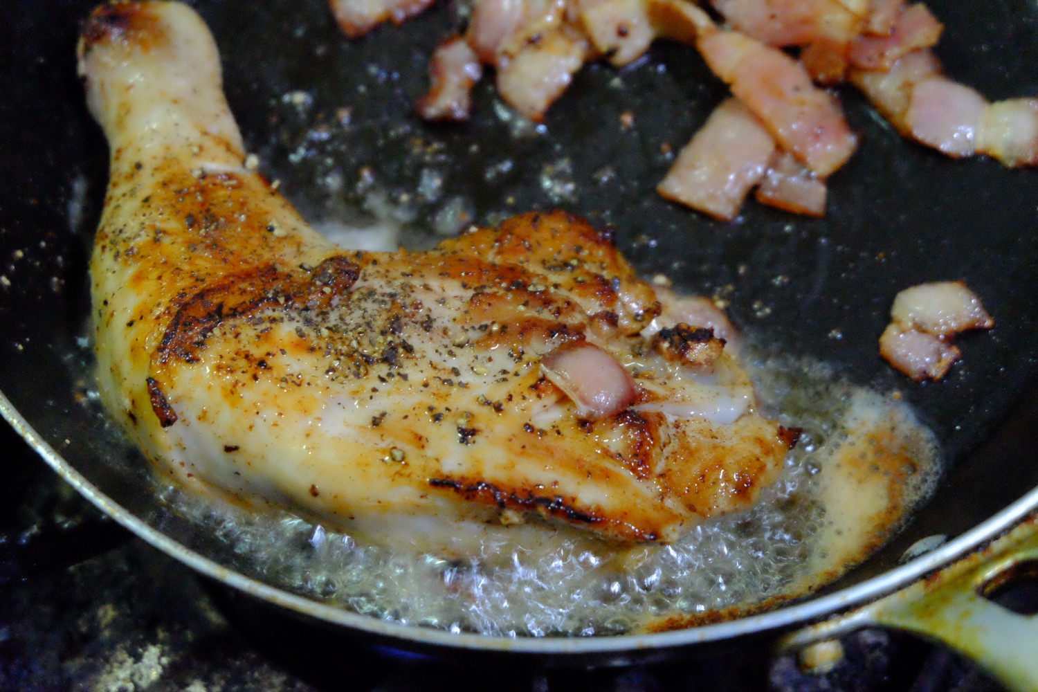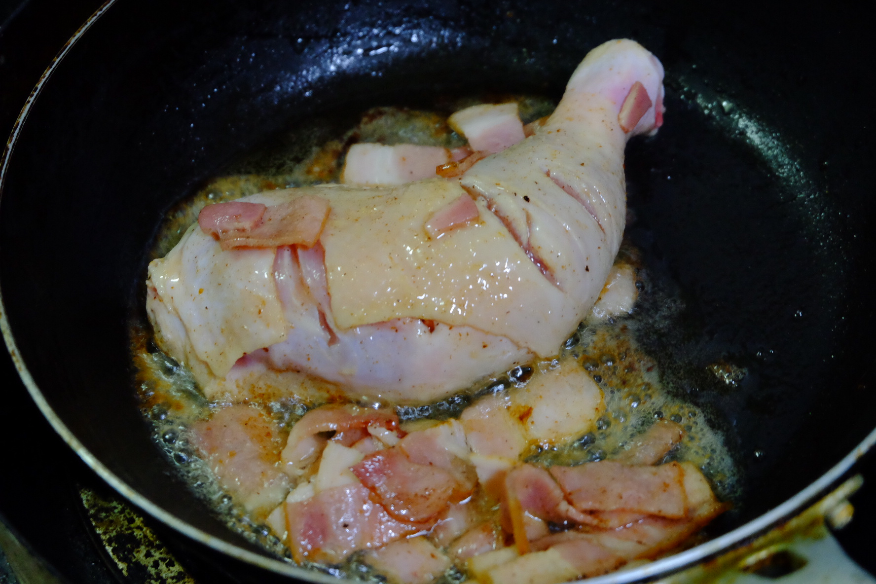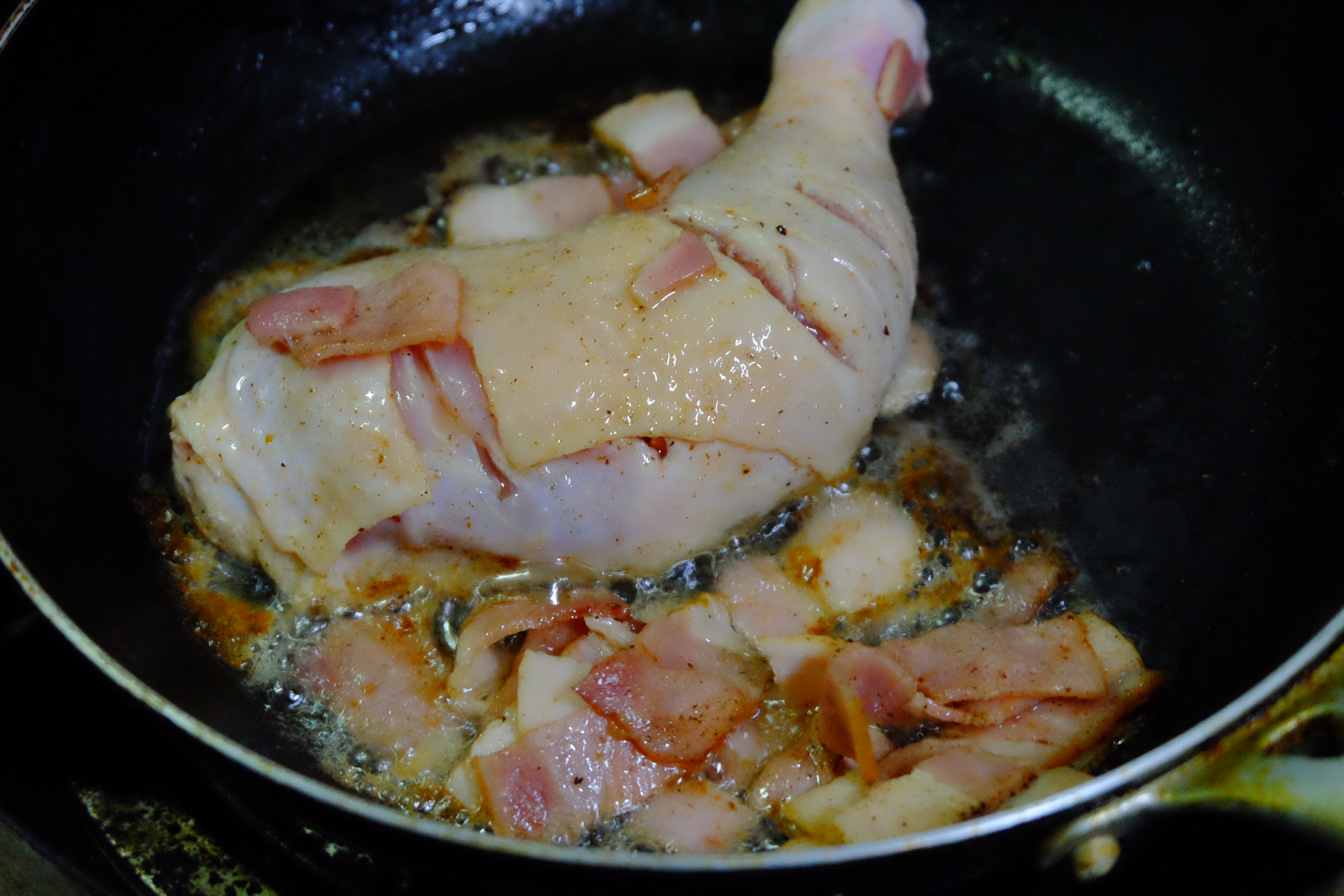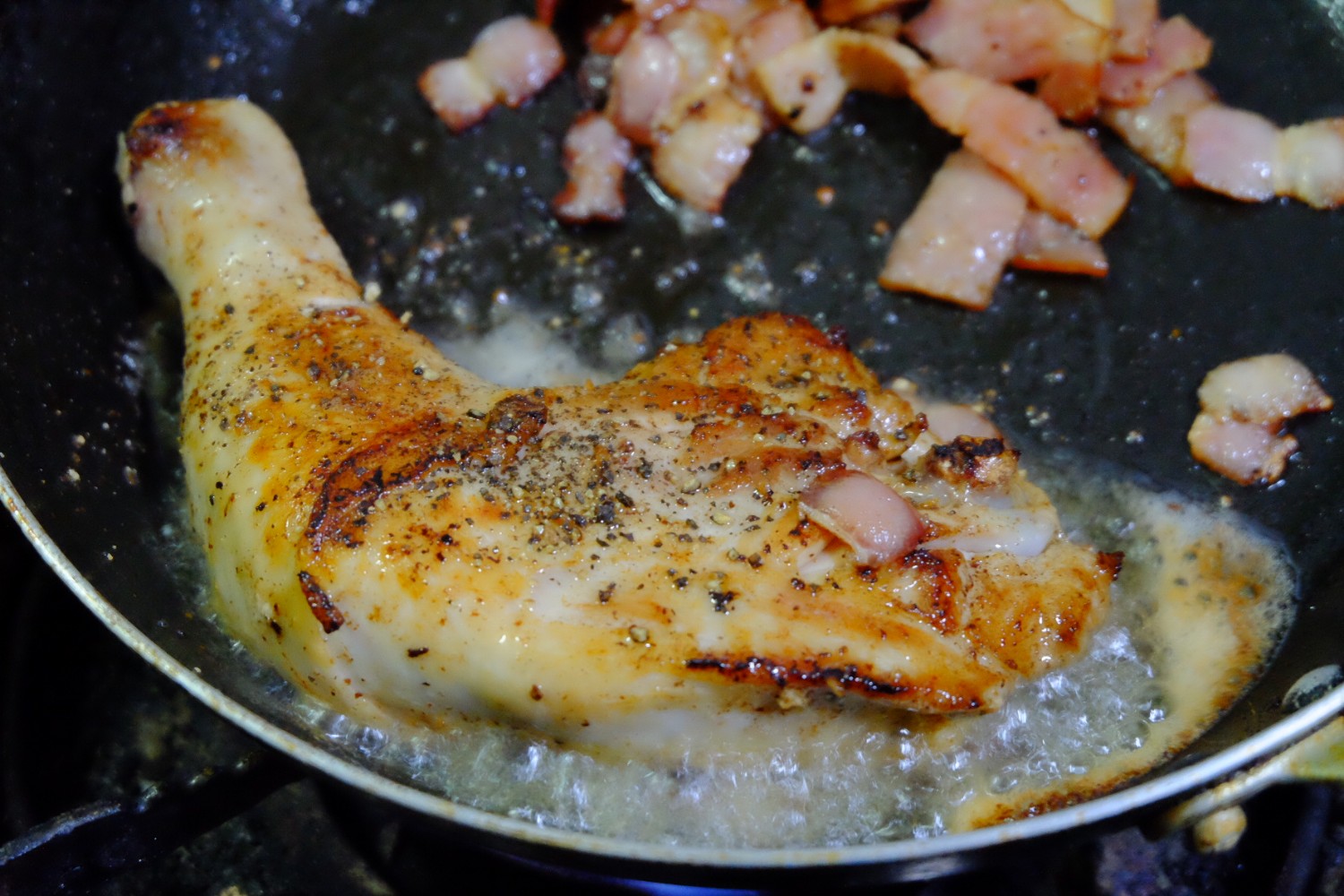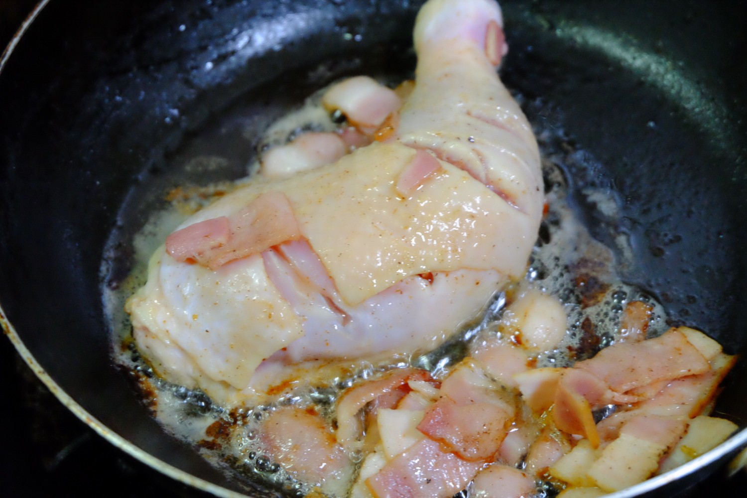 3. ตั้งกะทะใส่เนย และเบคอนลงไปเจียว แล้วนำไก่ลงไปทอด ถ้ากลัวเบคอนไหม้ ก็แยกออกไว้