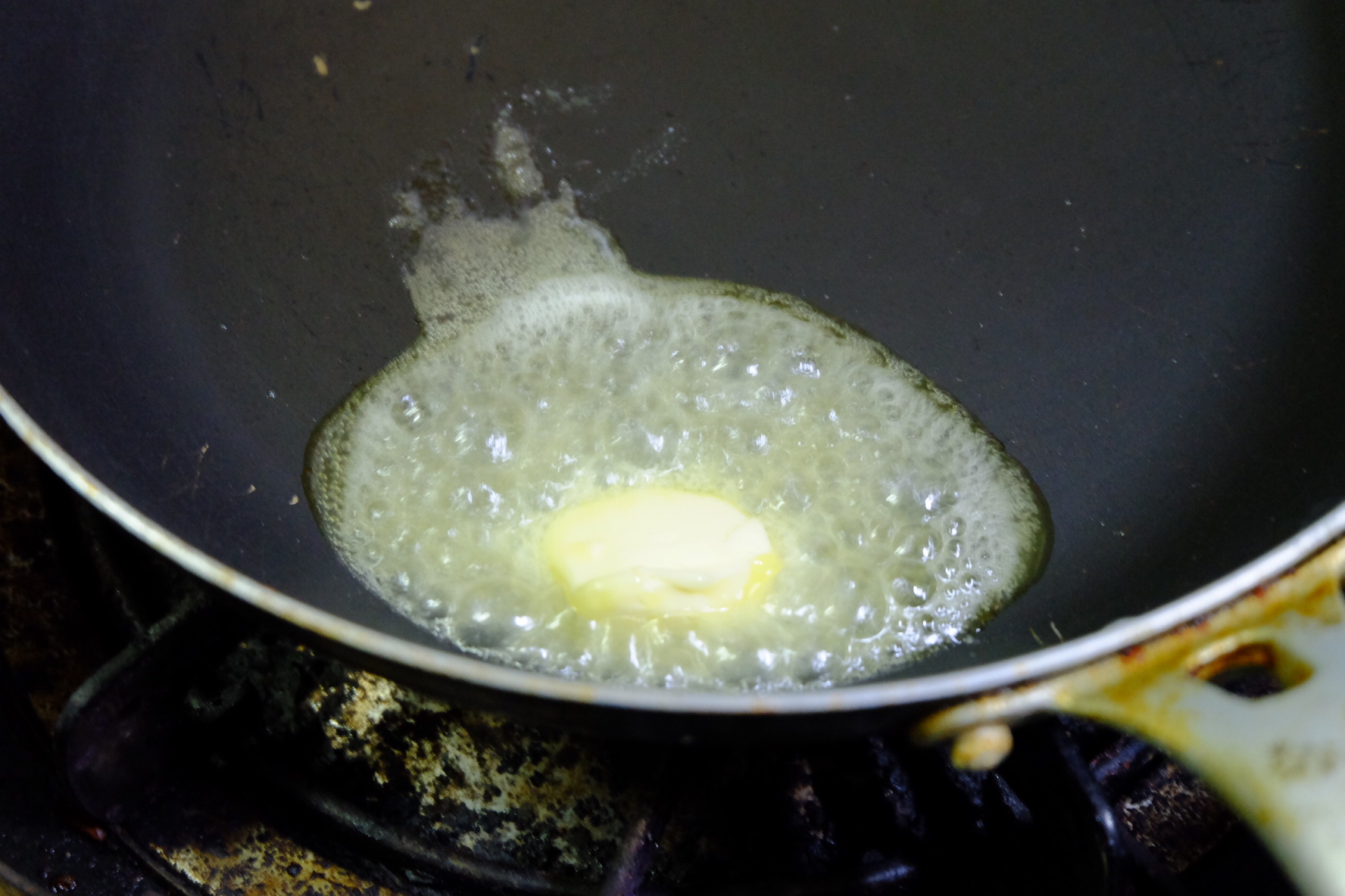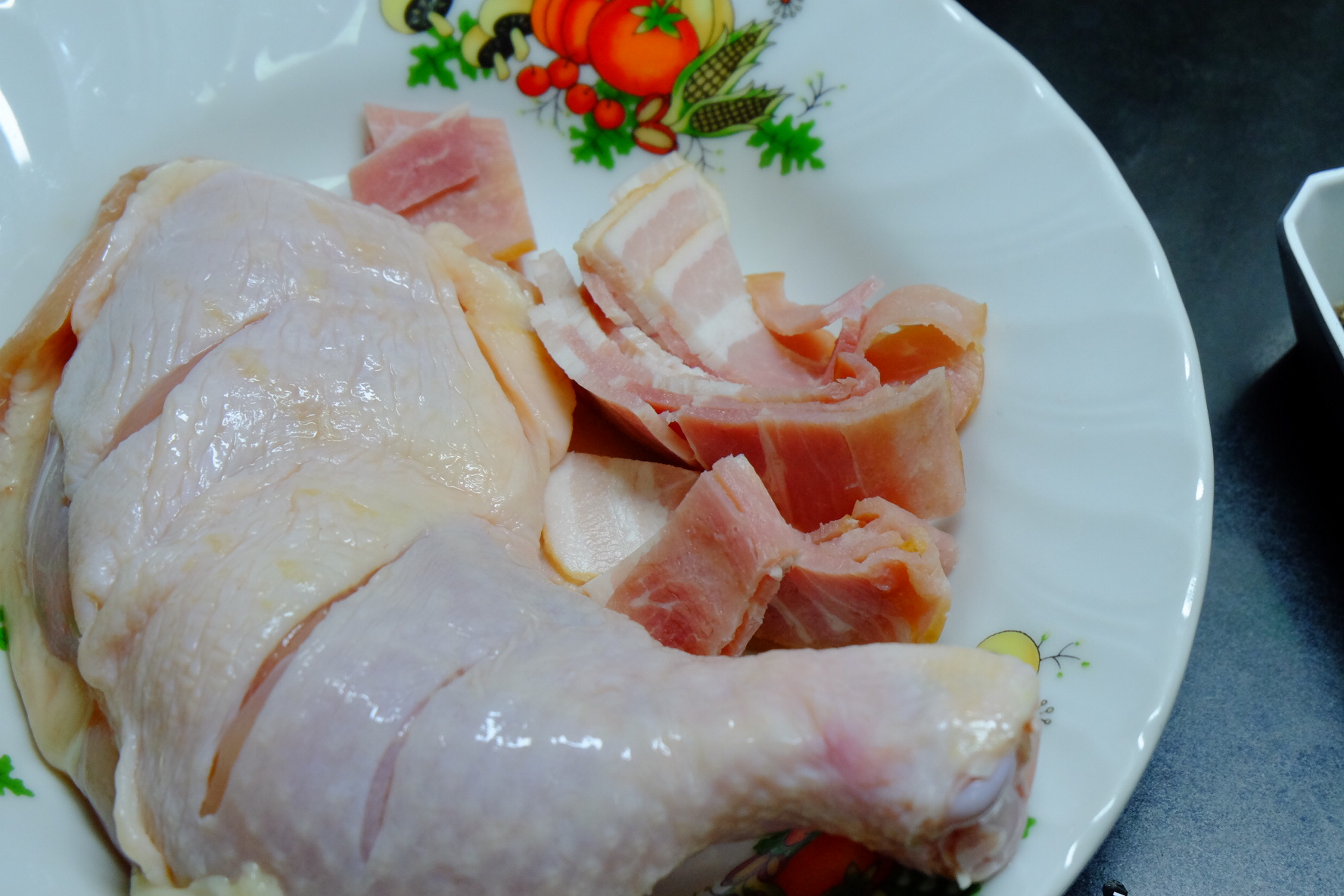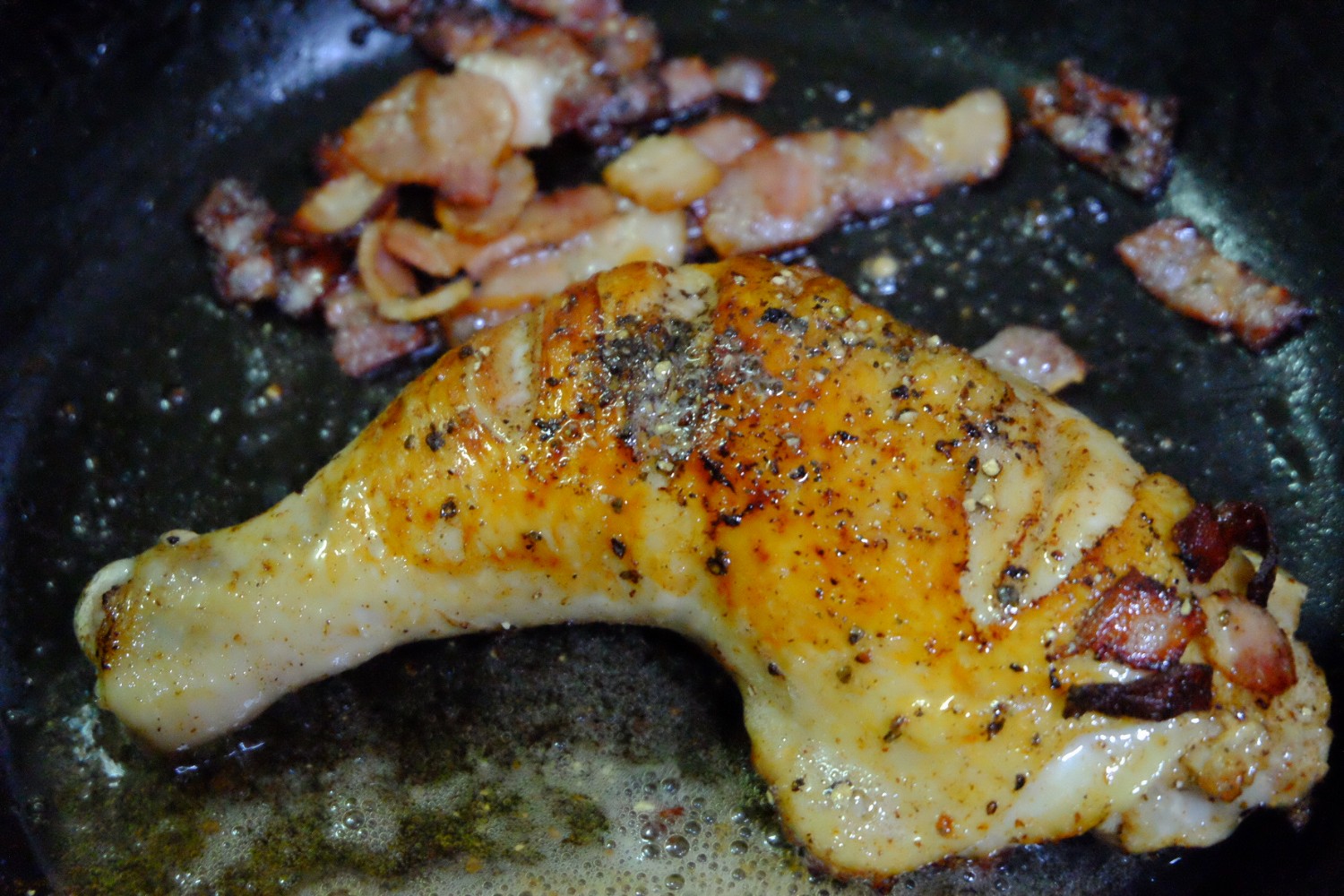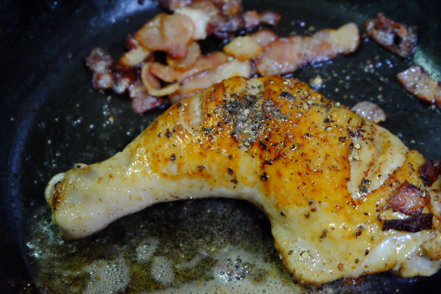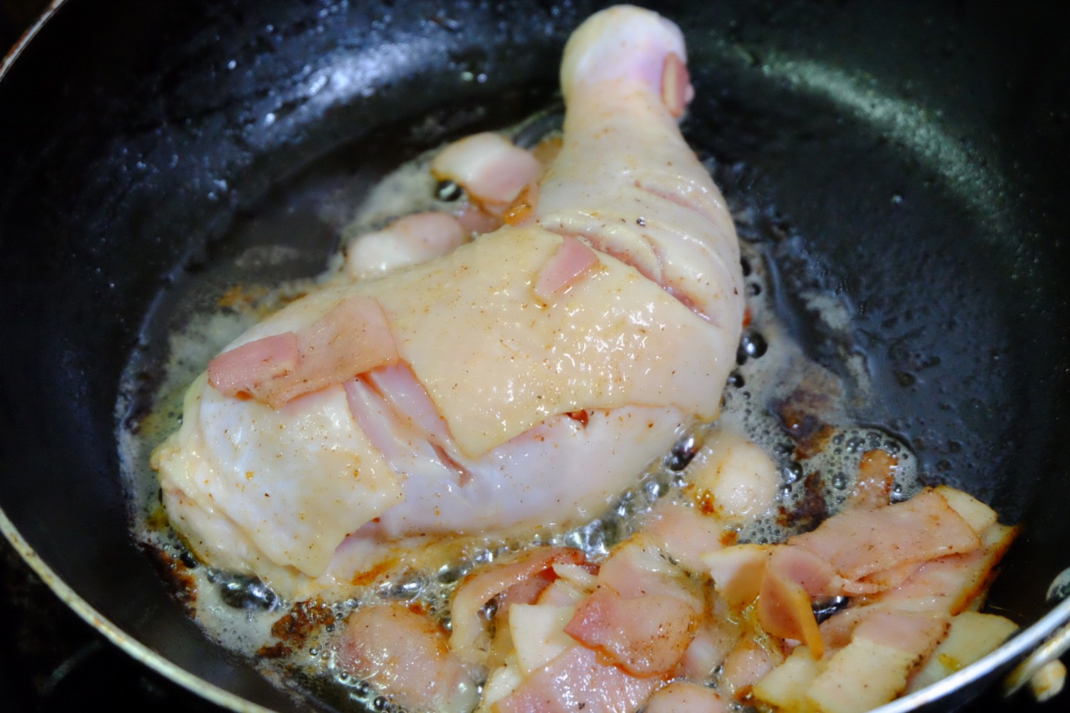 3. ตั้งกะทะใส่เนย และเบคอนลงไปเจียว แล้วนำไก่ลงไปทอด ถ้ากลัวเบคอนไหม้ ก็แยกออกไว้