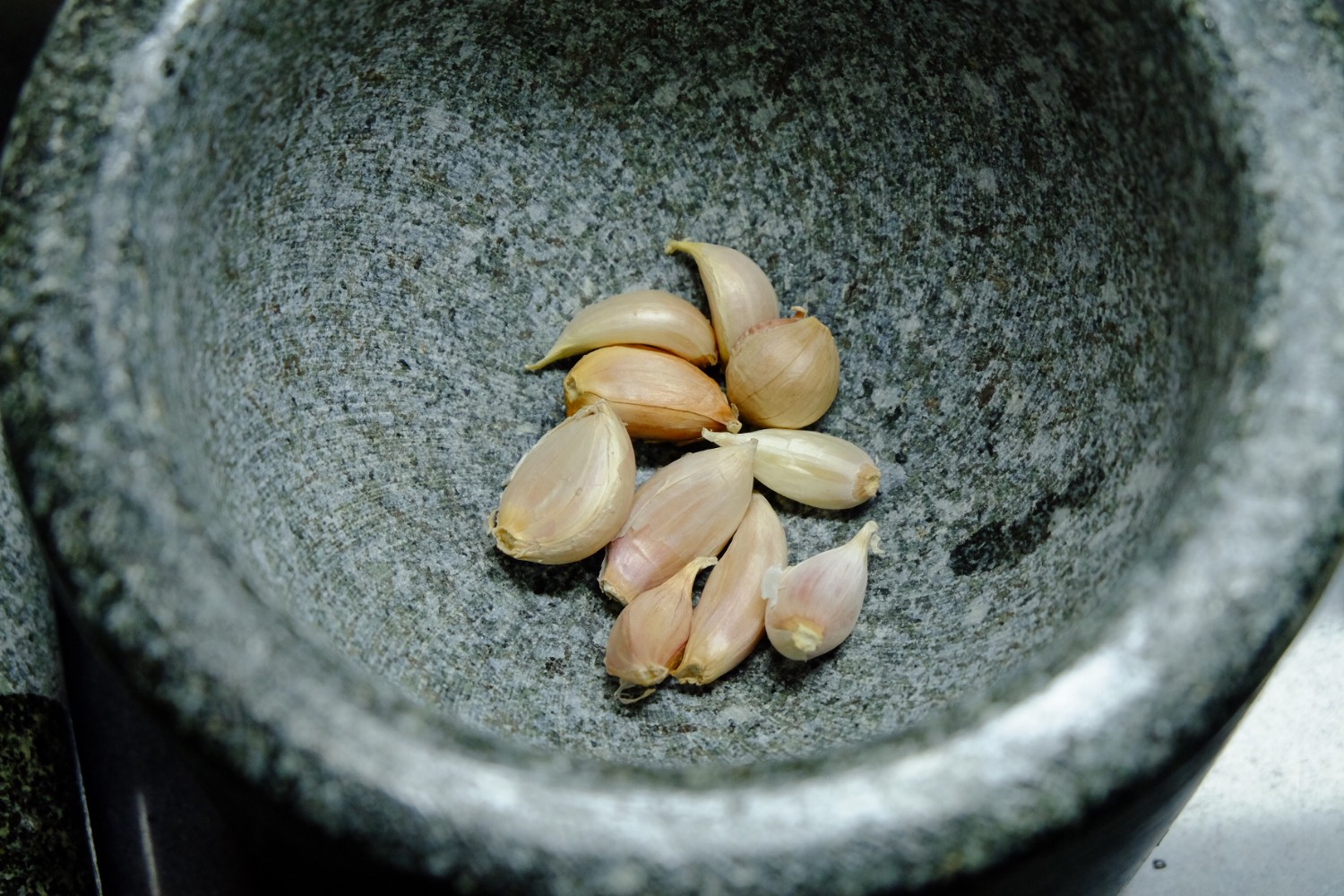 1. เตรียมกระเทียม รากผักชี โขลกเตรียมไว้