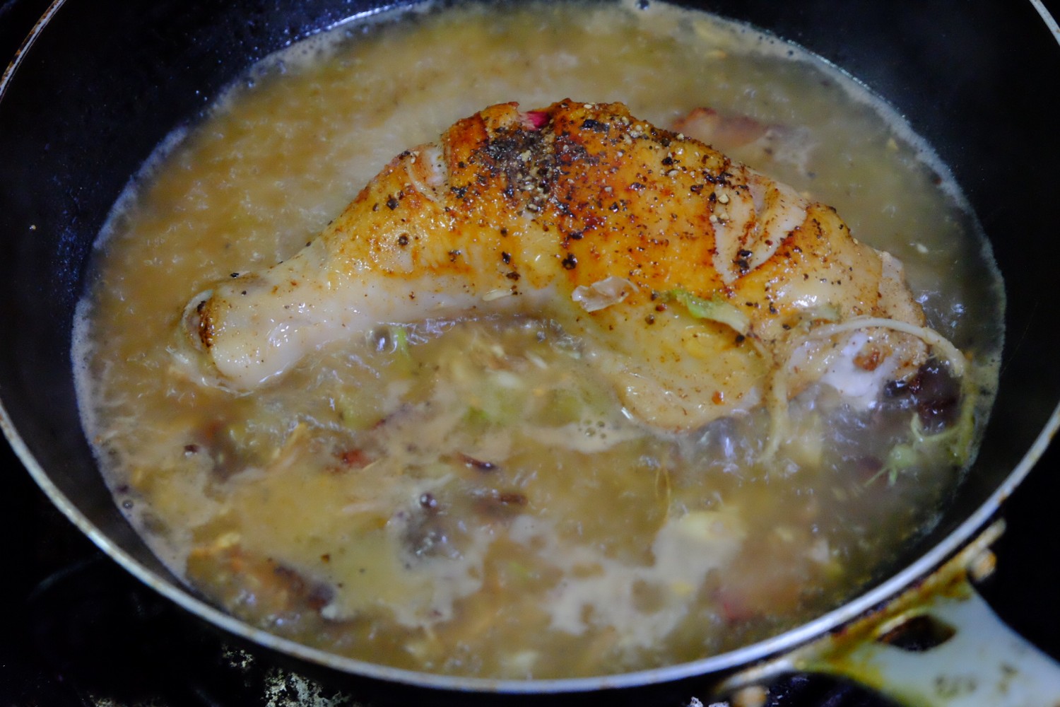 5. พอให้ไก่สุกสักนิดหน่อย ก็ใส่รากผักชี กระเทียมลงไปเจียวให้หอม แล้วเติมน้ำซุปลงไปตุ๋นต่ออีกสักพัก ใส่มิริน แล้วก็ใส่แป้งมันลงไปนิดหน่อย