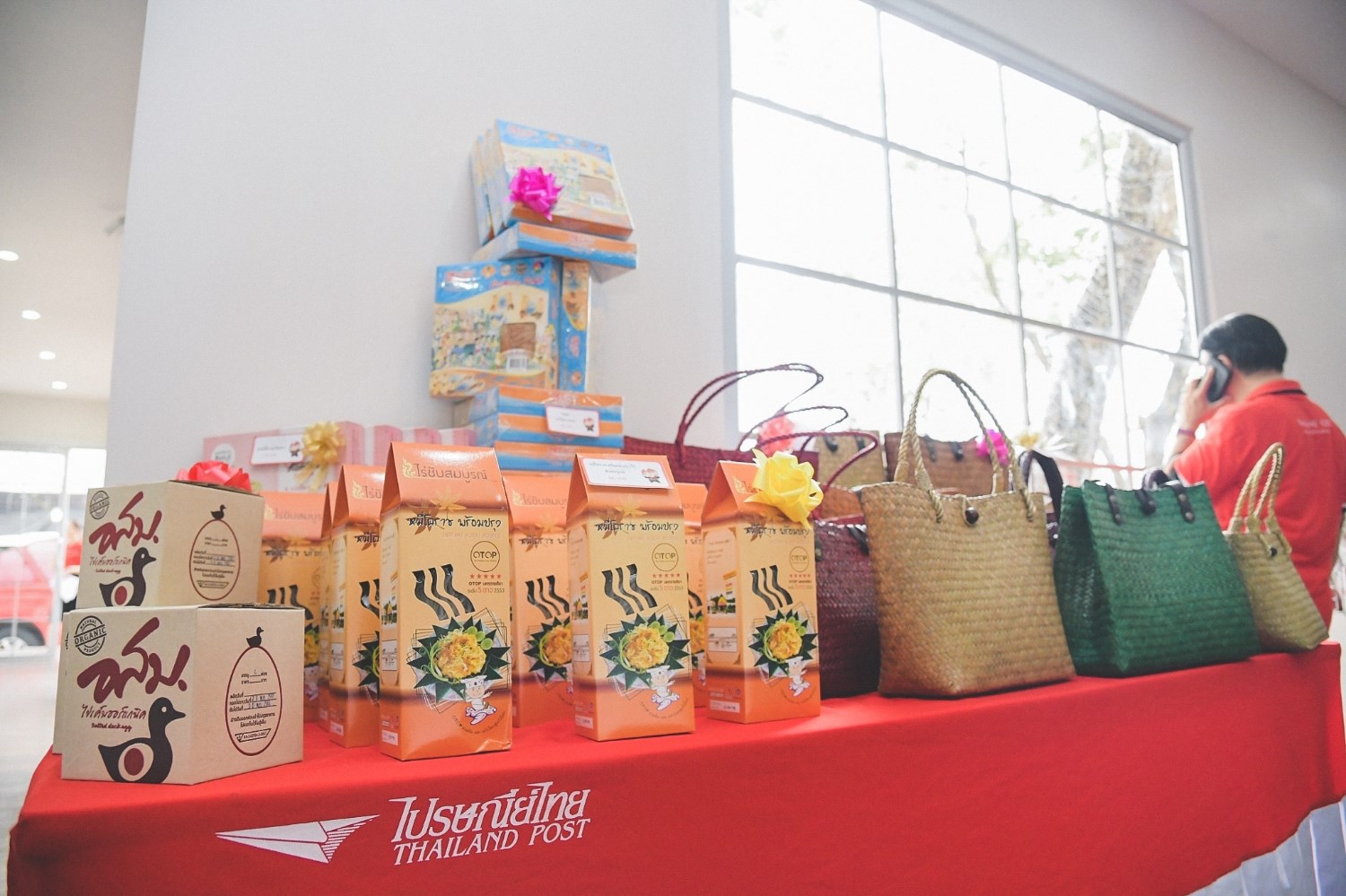 บูธนี้เป็นของไปรษณีย์ไทยนั่นเอง ชื่อร้านก็คือ “ไปรษณีย์เพิ่มสุข” จัดแบบเรียบหรู ดูดี มีมุมให้ถ่ายรูปแบบหวานๆ น่ารักๆ ภายในร้านก็เต็มไปด้วยสินค้าจากชุมชนทั่วไทย อยากได้แบบไหนมาเลือกซื้อได้ที่นี่