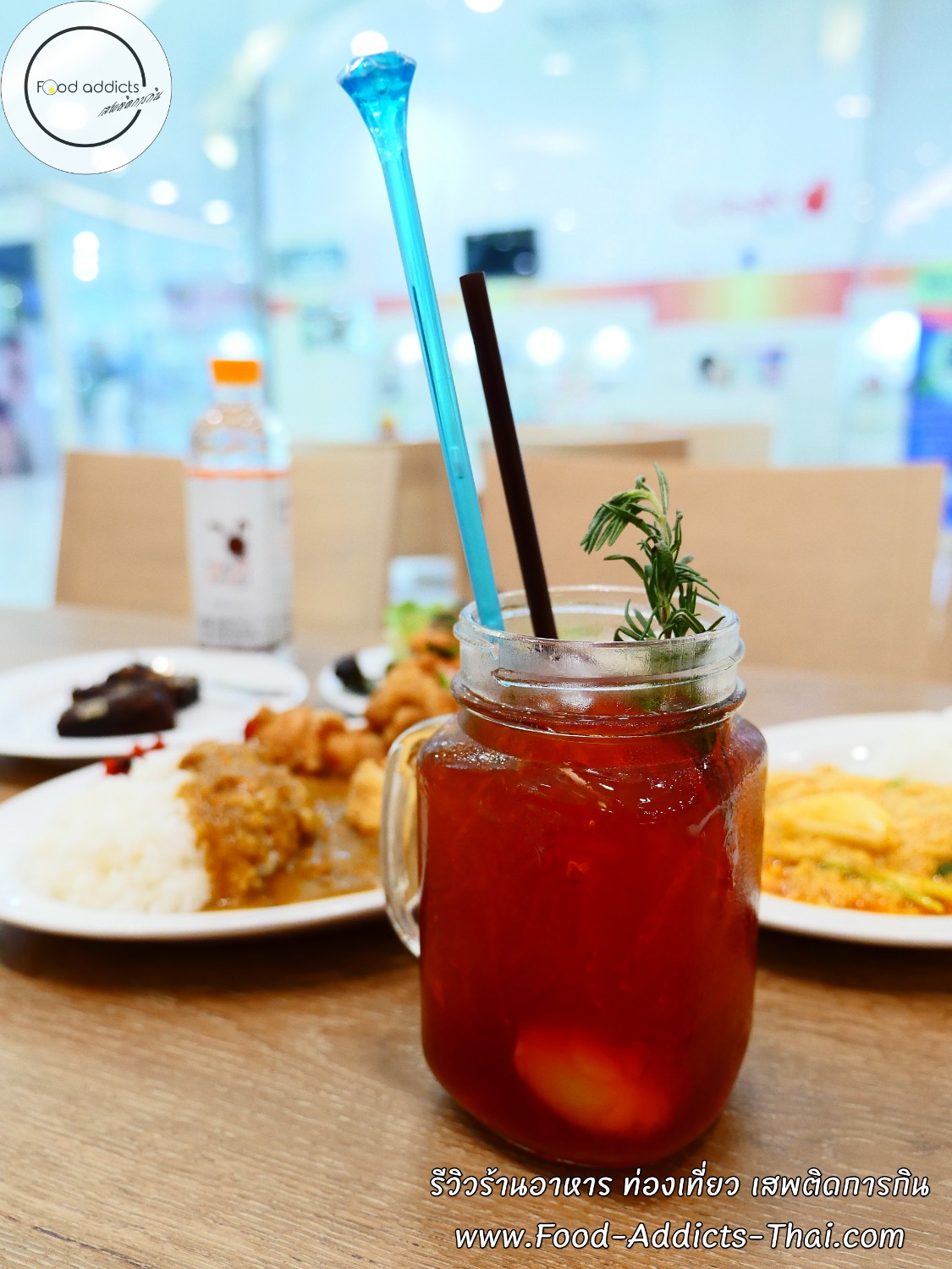 สั่งน้ำเปล่ามาทานอย่างเดียว ก็ดูจะไม่ครบรส ต้องมีน้ำหวานเพิ่มรสชาติสักหน่อย สั่งเป็นชาลิ้นจี่ ราคา 95 บาท(แอบแพงนิดนึง) ชาดำเข้มข้น ผสมน้ำลิ้นจี่และเนื้อลิ้นจี่ ปักด้วยก้านโรสแมรี่สด อร่อยหอม รสหวานปานกลาง อมเปรี้ยวเล็กน้อย ช่วยตัดเลี่ยน เพิ่มรสชาติ ตักแกงกระหรี่ทานได้เพิ่มอีกหลายจานเลย