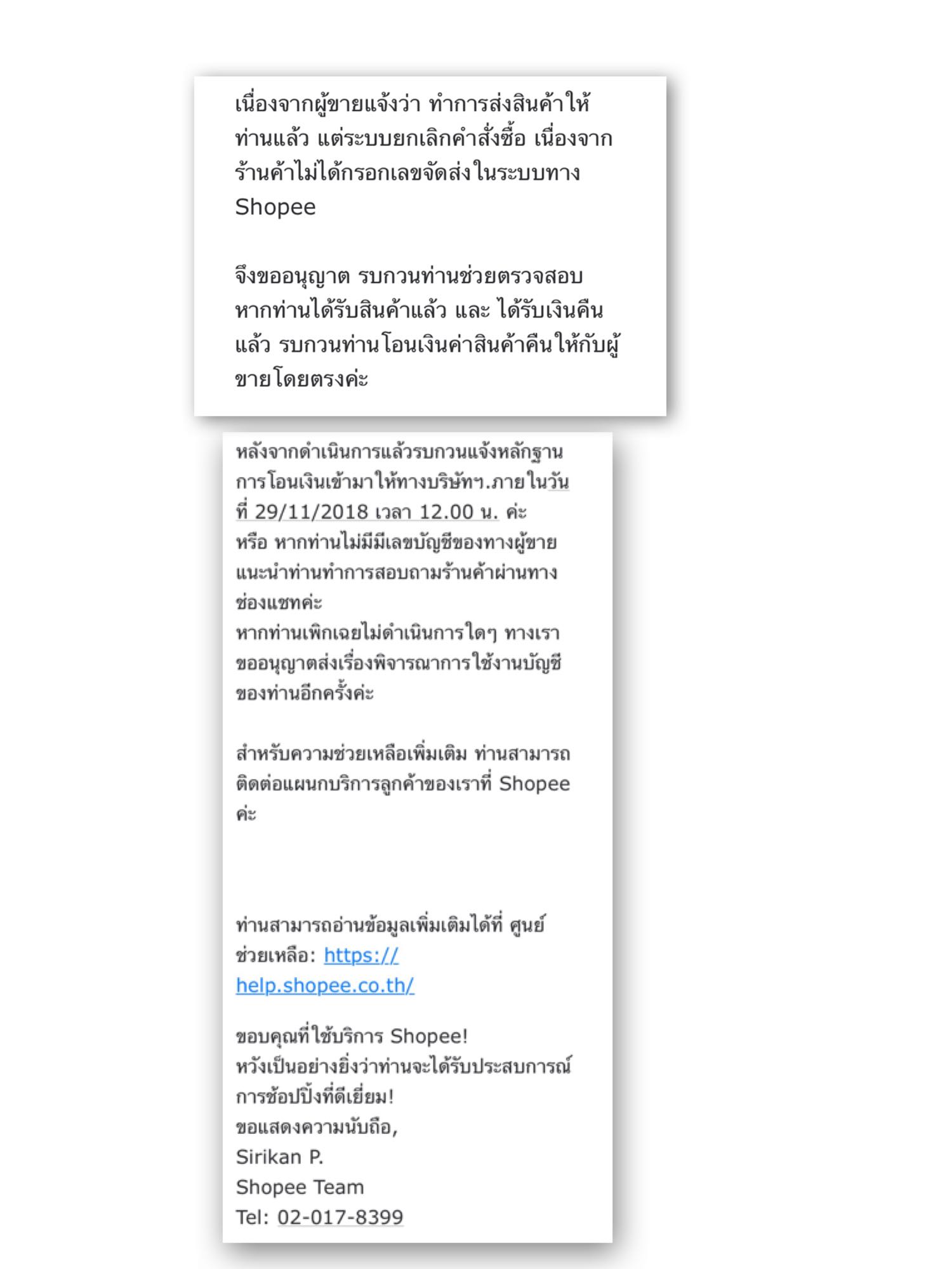 ในเมื่อช้อปปี้กับร้านค้าทำงานผิดพลาดเรื่องเงินเอง ไม่มีสิทธิ์มาโยนความผิดหรือเพิ่มภาระให้ลูกค้าแบบนี้ และมาใช้คำพูดว่าจะพิจารณาบัญชีของลูกค้า ถือเป็นคำพูดที่นักเลงและแสดงถึงการบริการที่ต่ำอีกด้วย เพราะเคสนี้นอกจากลูกค้าไม่ผิดและไม่ได้เกี่ยวข้องกับการทำงานที่ล้มเหลวของคุณทั้งสองฝ่าย ช้อปปี้ยังทำให้ลูกค้าเสียเวลาทำเรื่องโอนเงินใหม่ และรอเงินคืนจากธนาคารเจ้าของบัตรเครดิตเอง ลูกค้าก็ไม่ทราบว่าจะได้เงินคืนจากธนาคารจริงหรือไม่ ต้องคอยโทรถามธนาคารเองทุกวัน และการโอนเงินให้ร้านอีกครั้งจะเป็นการชำระค่าสินค้าซ้ำซ้อนหรือไม่ ถ้ามีพนักงานชอปปี้ในพันทิพ ลูกค้าสงสัยว่าคุณจะรับผิดชอบค่าเสียเวลา ค่าเสียสุขภาพจิต ค่าโทรศัพท์ที่ลูกค้าต้องตามเรื่องต่างๆ จากธนาคารอย่างไร และรบกวนลบข้อความบรรทัดสุดท้ายที่บอกว่าประสบการณ์ช้อปปิ้งยอดเยี่ยมออก เพราะคุณไม่ได้แคร์ลูกค้าแม้แต่น้อย