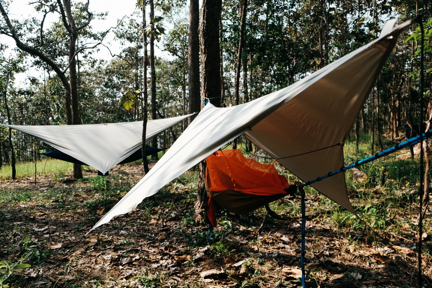 ก่อนอื่น ต้องกางเต้นท์ก่อนน้า จะได้เอากระเป๋าใส่ไว้ในเต้นท์เน้อ หรือจะผูกเปลนอนก็ได้จ้า