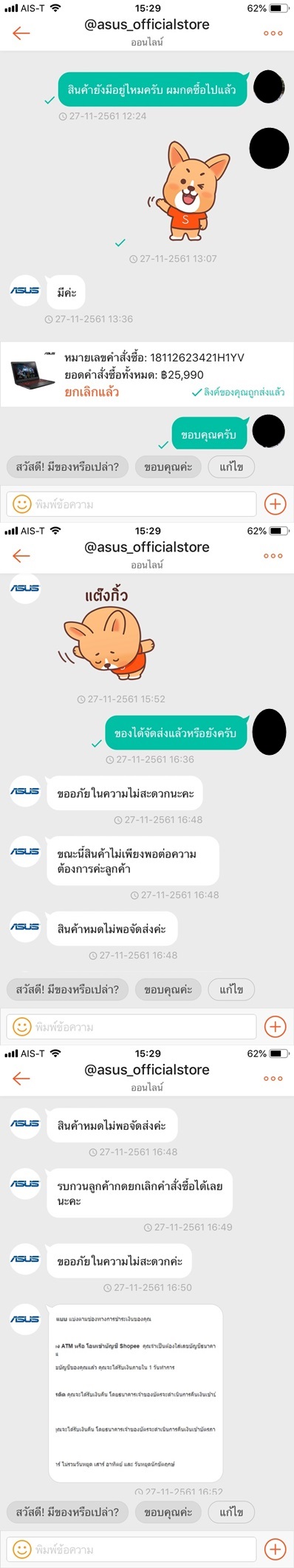 วันนี้ผมจะมาแบ่งประสบการณ์ การซื้อของกับ Shopee นะครับ พอดีผมอยากเปลี่ยน Notebook ใหม่ เข้าไปใน Shop ของ asus_officialstore เพราะเป็น Official Store เลยมีความน่าเชื่อถือ ตอนแรกกดซื้อของไปแล้วครับ แล้วมาแชทถามกับ asus_officialstore ว่าของยังมีอยู่หรือเปล่า พนักงงานก็ตอบว่ายังมีของอยู่ พอถามอีกว่า จะจัดส่งของเมื่อไหร่ พนักงานก็ตอบมาบอกว่า ของหมด เอ้า ! ตกลงมันยังไงกัน ทำไมตอนแรกบอกว่าของยังมีอยู่ พนักงานก็บอกให้ผมยกเลิกการซื้อสินค้า แล้วทำเรื่องของเงินคืนจากทาง Shopee แต่ว่าระยะเวลาการทำเรื่องคืนเงิน นานมาก เพราะผมใช้บัตรเคดิตในการซื้อสินค้า คือตกลงจะต้องรอเงินคืนก่อนใช่ไหมครับ ก่อนที่จะได้สั่งสิ้นค้าอีกรอบ ความเสียเวลาแบบนี้ไม่ยุติธรรมกับลูกค้าเสียใจ พนักงานก็บอกแค่ว่าขอโทษ ผมรู้สึกว่ามันไม่ OK เท่าไหร่กับการที่ต้องรอ