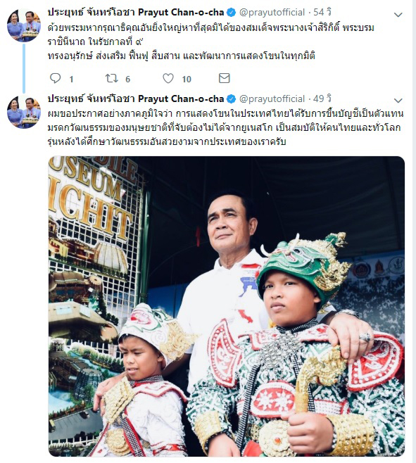 29 พ.ย.61 พล.อ.ประยุทธ์ จันทร์โอชา นายกรัฐมนตรี ทวีตข้อความผ่านทวิตเตอร์ ระบุว่า “ด้วยพระมหากรุณาธิคุณอันยิ่งใหญ่หาที่สุดมิได้ของสมเด็จพระนางเจ้าสิริกิติ์ พระบรมราชินีนาถ ในรัชกาลที่ ๙ ทรงอนุรักษ์ ส่งเสริม ฟื้นฟู สืบสาน และพัฒนาการแสดงโขนในทุกมิติ ผมขอประกาศอย่างภาคภูมิใจว่า การแสดงโขนในประเทศไทยได้รับการขึ้นบัญชีเป็นตัวแทนมรดกวัฒนธรรมของมนุษยชาติที่จับต้องไม่ได้จากยูเนสโก เป็นสมบัติให้คนไทยและทั่วโลกรุ่นหลังได้ศึกษาวัฒนธรรมอันสวยงามจากประเทศของเราครับ”